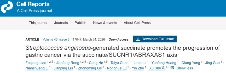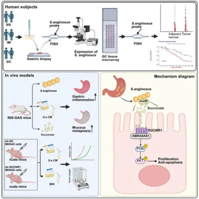 研究团队通过收集胃癌患者的组织样本,结合16S rRNA基因测序分析,确认咽峡炎链球菌在胃癌组织中特异性富集,且其丰度与患者不良预后呈正相关。在体外实验中,研究人员用咽峡炎链球菌的条件培养基处理胃癌细胞,发现可显著促进细胞增殖、侵袭和迁移能力,并抑制细胞凋亡;动物模型进一步显示,该细菌感染可加重胃部炎症反应和胃黏膜肠上皮化生,加速肿瘤进程。通过代谢组学分析,琥珀酸被鉴定为咽峡炎链球菌分泌的关键功能性代谢产物,其在胃癌微环境中浓度升高。后续功能实验表明,敲低琥珀酸受体SUCNR1或使用其特异性抑制剂,能有效阻断琥珀酸的促瘤效应,验证了SUCNR1在通路中的核心地位。这些发现不仅明确了咽峡炎链球菌的致癌作用,还首次将琥珀酸定义为连接细菌感染与癌症进展的信号分子,为靶向治疗提供了实验基础。