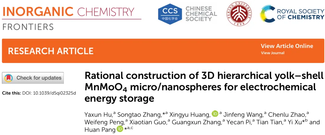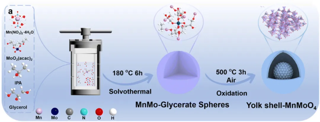 近日,扬州大学化学与材料学院庞欢教授、测试中心张松涛博士和南昌大学徐一教授团队通过简单的一步自模板法,使用尺寸、形貌可控的金属甘油酸盐纳米球为前驱体,在空气气氛中进行高温煅烧,得到了蛋黄壳结构 MnMoO₄。并且通过多种材料表征技术系统地研究了影响蛋黄壳形貌形成的关键因素。研究表明,由于蛋黄壳材料独特的空心结构能够有效缓冲充放电循环中产生的机械应力,蛋黄壳 MnMoO₄ 表现出优异的电化学性能,为过渡金属氧化物蛋黄壳结构在储能应用中的合理合成和性能优化提供了宝贵数据。