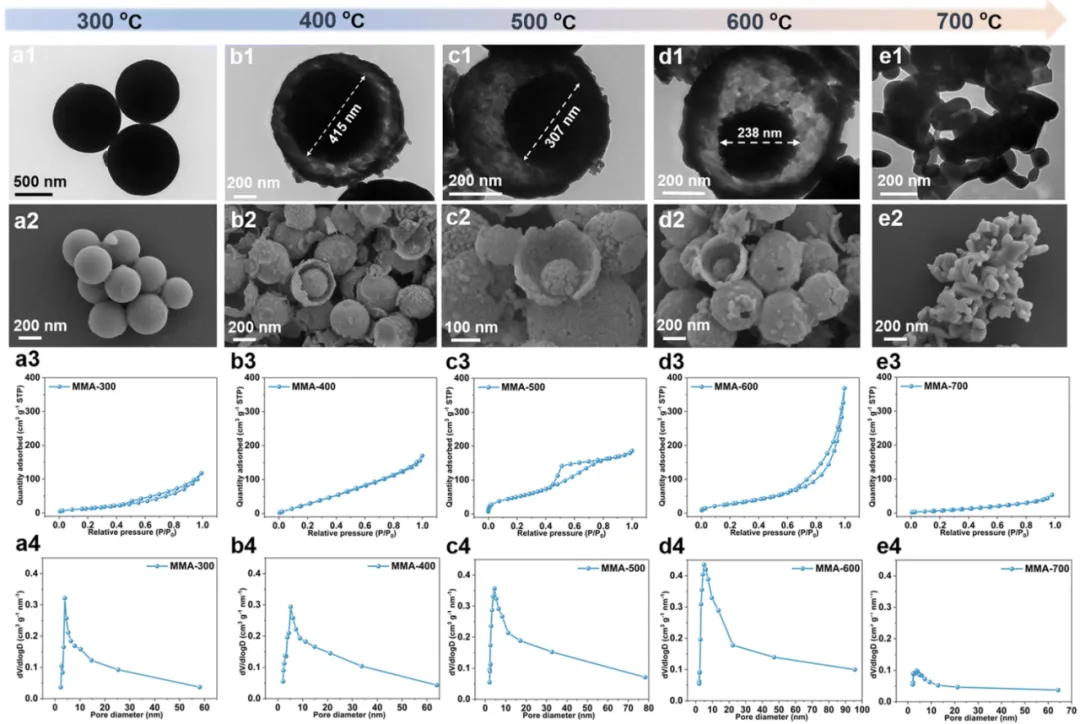 图2 (a1-e2) 不同煅烧温度下材料的 SEM 及 TEM 图像;(a3-e4) 不同煅烧温度下材料的产物的 N2 吸附-脱附等温线和孔径分布图。