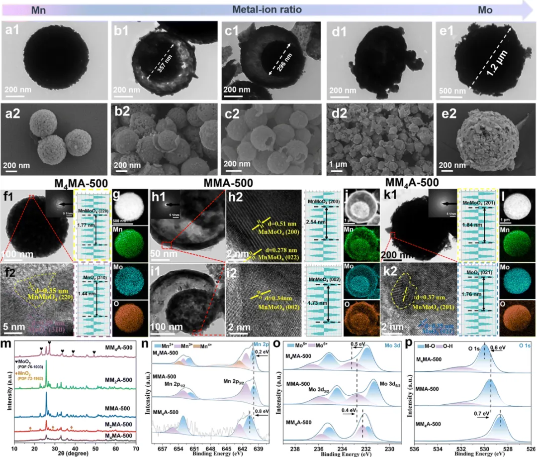 图3 (a-e) 不同金属比例煅烧产物的 TEM 和 SEM 图像;(f,g) M₄MA-500 的 HRTEM 图像和 EDS 元素分布图;(h-j) MMA-500 的 HRTEM 图像及 EDS 元素分布图;(k,l) MM₄A-500 的 HRTEM 图像及 EDS 元素分布图;(m) MₓMᵧA-500 的 XRD 光谱;与对应的 (n) Mn 2p;(o) Mo 3d 和 (p) O 1s 的高分辨率 XPS 光谱。