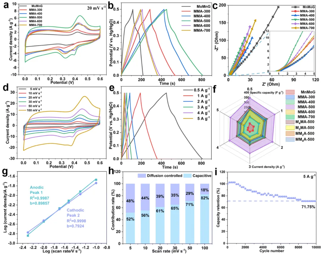图4 不同煅烧温度的产物的 (a) 20 mV s⁻¹ 时的 CV 曲线;(b) 0.5 A g⁻¹ 时的 GCD 曲线;(c) EIS 曲线。蛋黄壳 MnMoO₄ 电极的 (d) 在不同扫描速率下的 CV 曲线;(e) GCD 曲线;(f) 不同样品的比电容;(g) 对数峰值电流与对数扫描速率图;(h) 不同扫描速率下的电容贡献;(i) 长期循环稳定性。