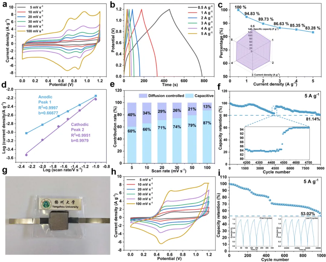 图5 两电极设备的电化学测试:(a) 不同扫描速率下的 CV 曲线;(b) 不同电流密度下的 GCD 曲线;(c) 不同电流密度下的比电容和电容保持率;(d) 对数峰值电流与对数扫描速率图;(e) 不同扫描速率下的电容贡献;(f) 长循环稳定性测试。柔性超级电容器器件的:(g) 光学图片;(h) 不同扫描速率下的 CV 曲线;(i) 1000 圈长循环稳定性测试。