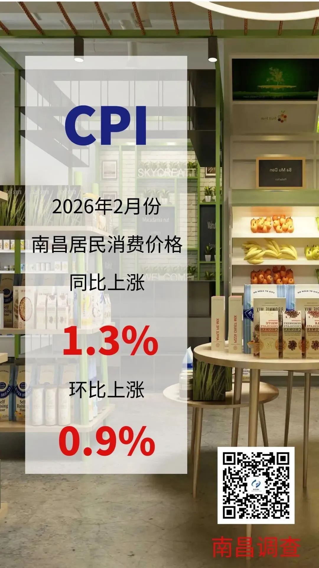 2026年2月份,南昌市居民消费价格同比由上月持平转为上涨1.3%,环比上涨0.9%,涨幅较上月扩大0.8个百分点。
