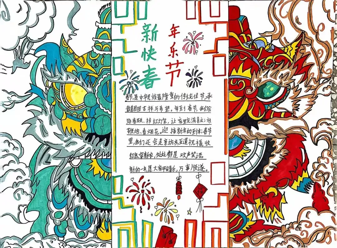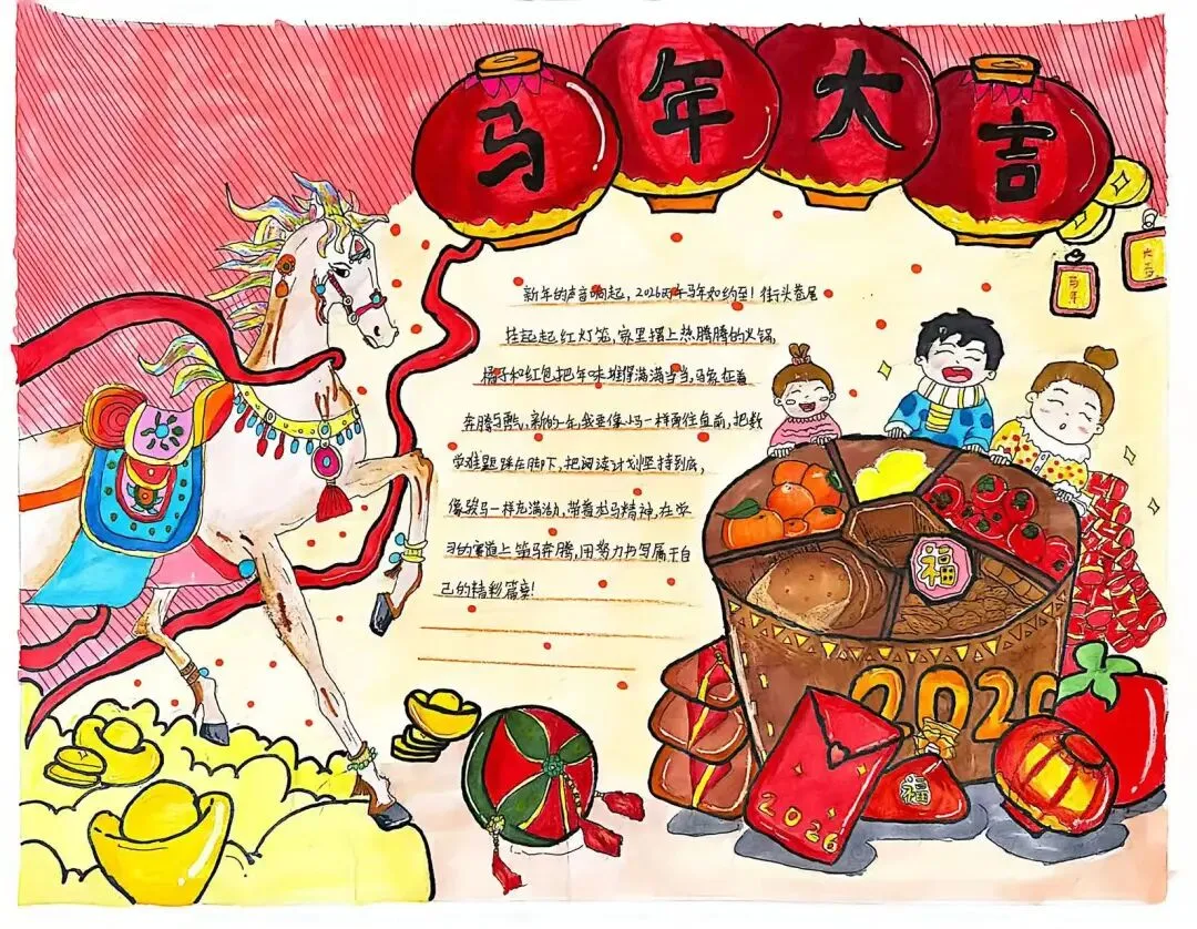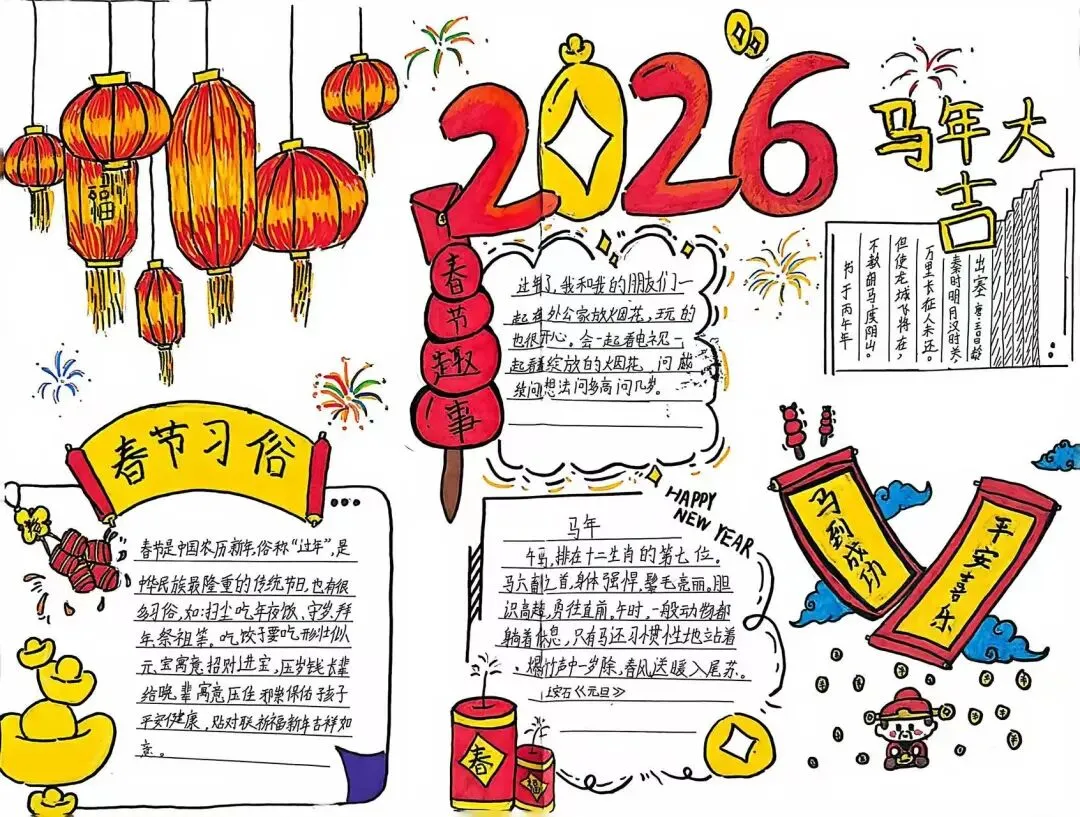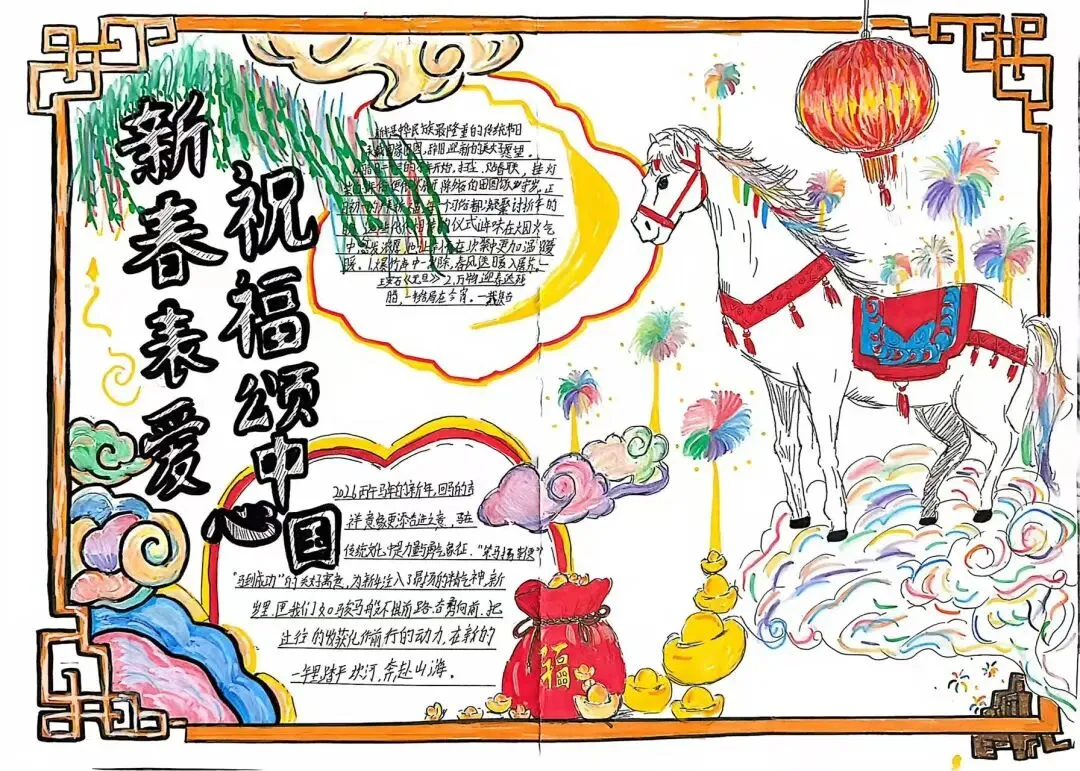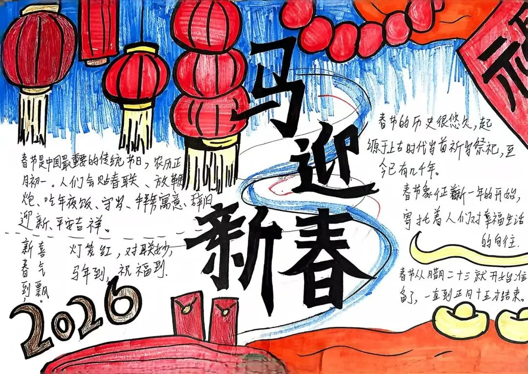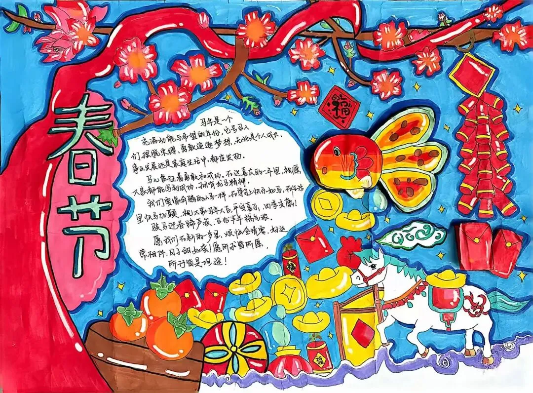 骏马踏春至,少年奋蹄时! “马”象征着奔腾不息、勇往直前的精神,正如你们在成长的道路上蓄势待发、勇敢前行。假不仅是休息放松的时光,更是我们成长与进步的契机。为深入贯彻“双减”政策,践行“立德树人”理念,南昌县墨山街小学精心策划了以“德、智、体、美、劳”全面发展为核心,饱含趣味、充满体验的寒假德育实践作业。同学们通过搜集节日资料,学习节日文化,深入了解春节的来历、习俗等,编创出了内容丰富,色彩艳丽,形式多样的节日小报。通过编创节日小报,同学们展示了自己的节日收获和感悟,加深了对中国传统文化的理解,感受到了祖国传统文化的博大精深!下面让我们一起来看看吧!