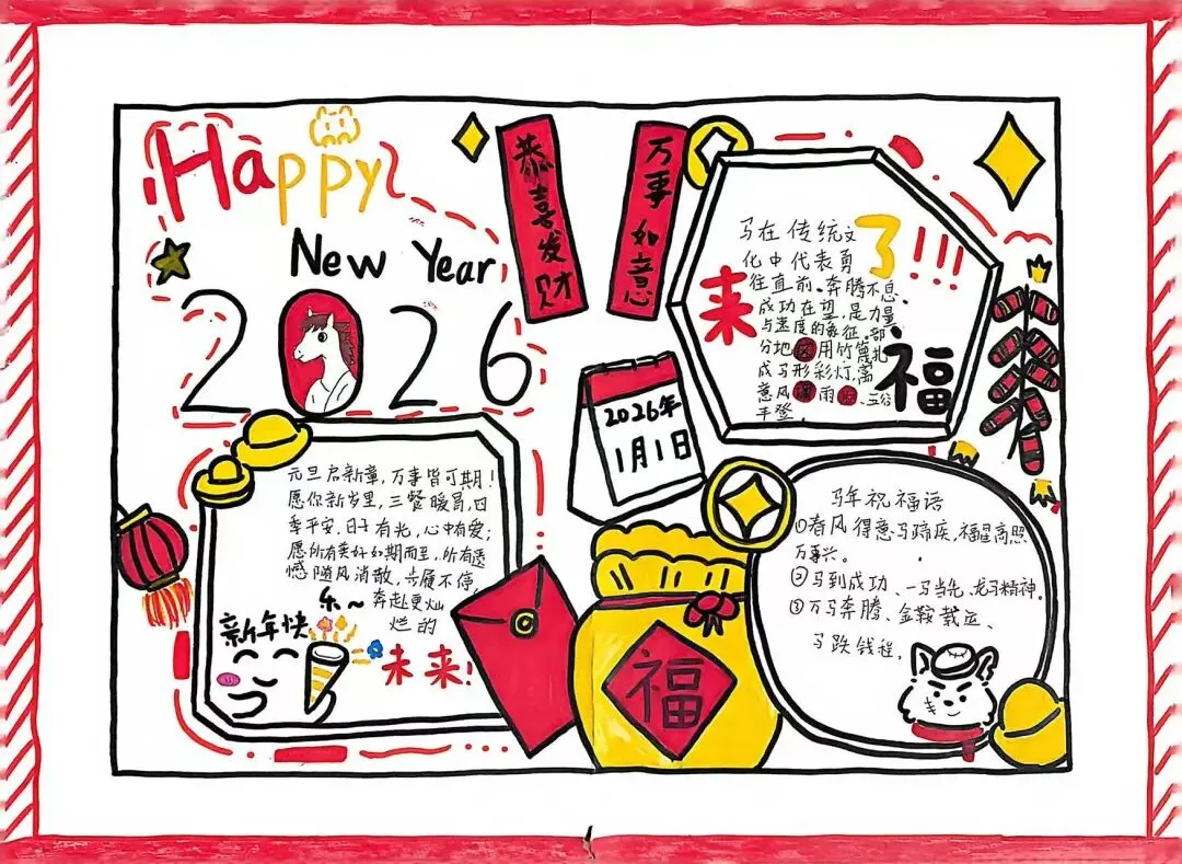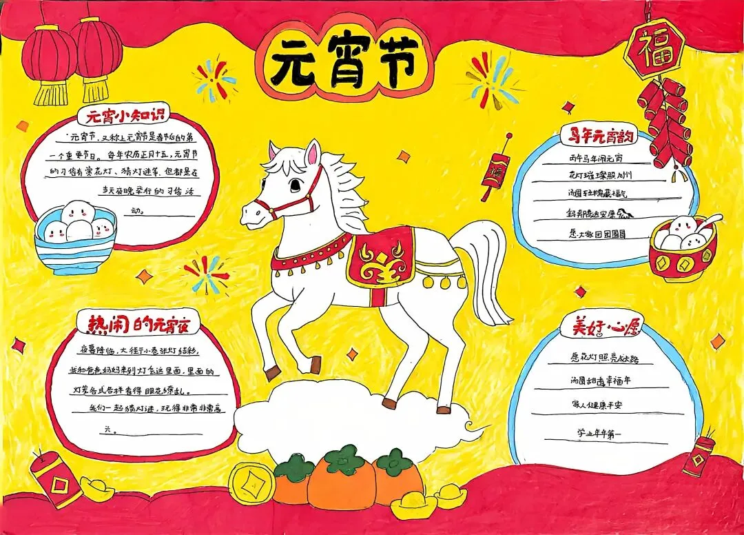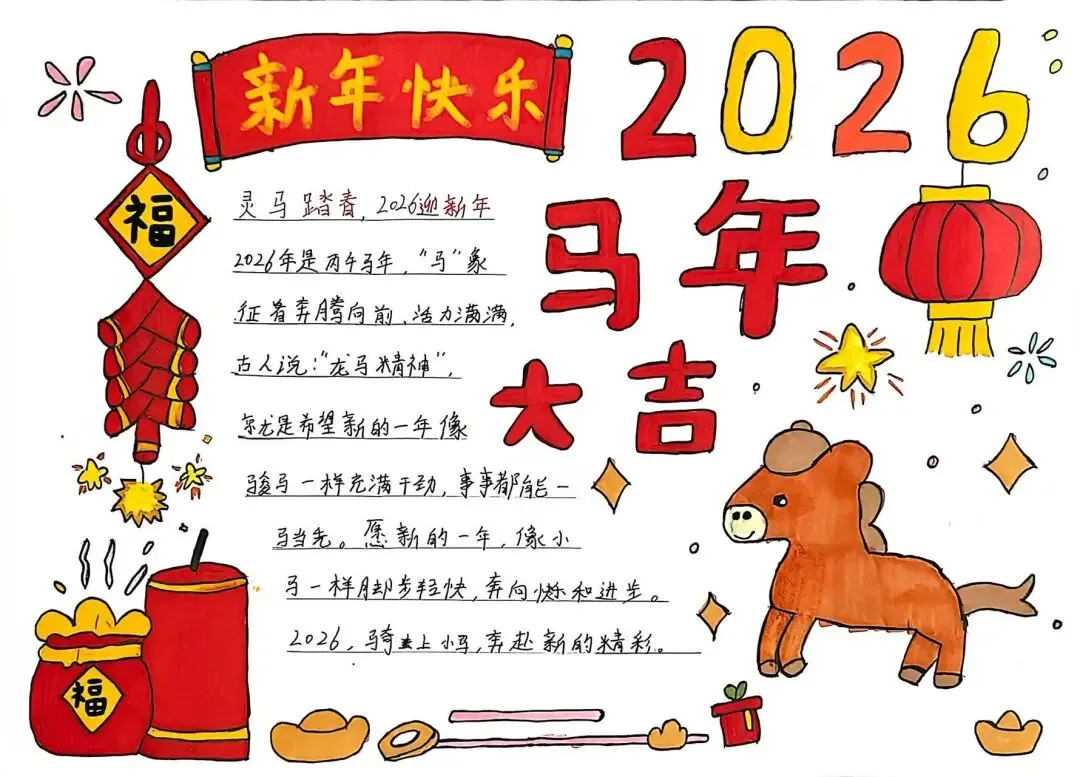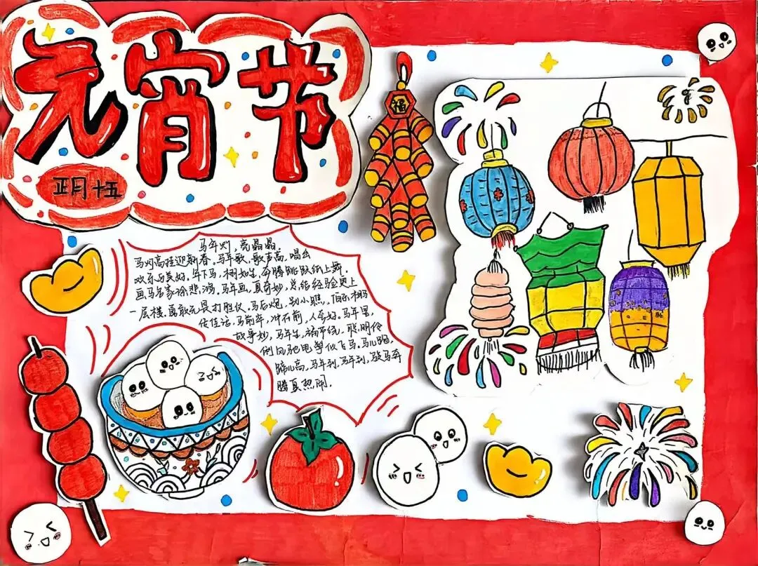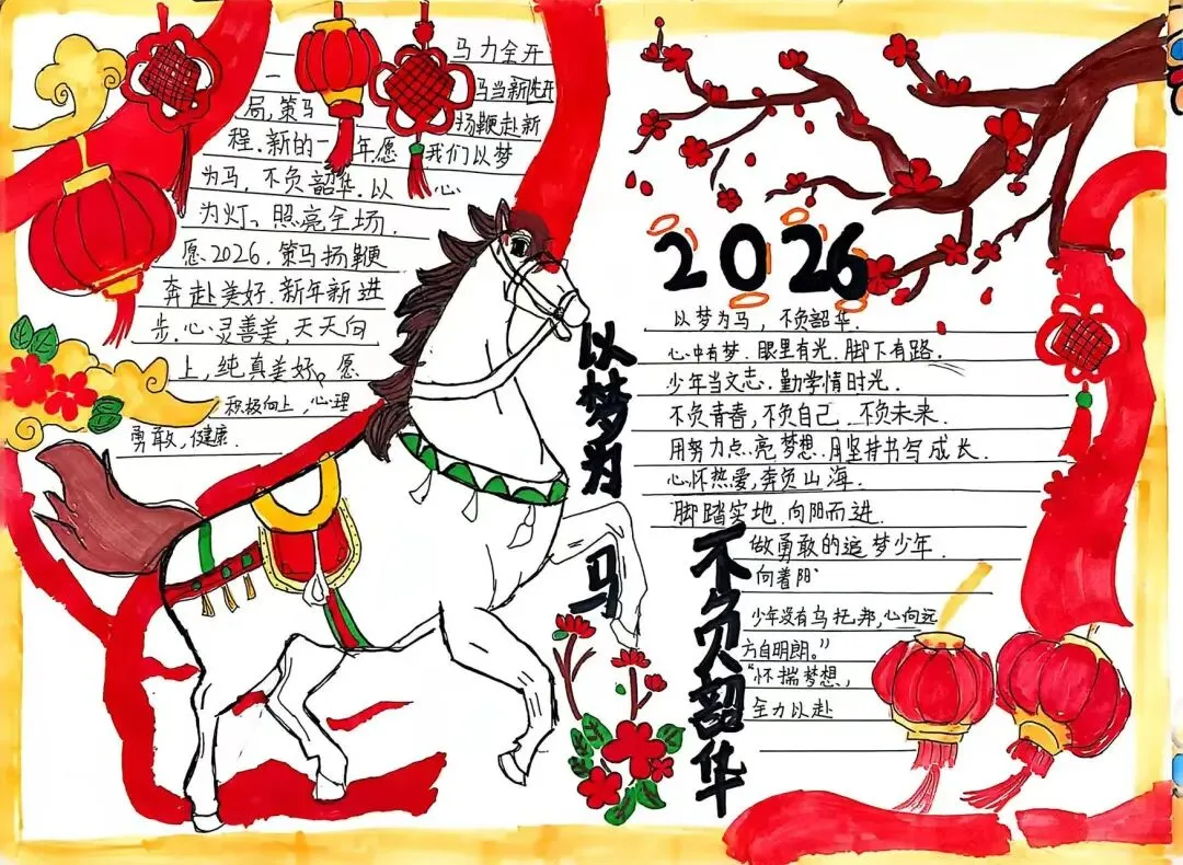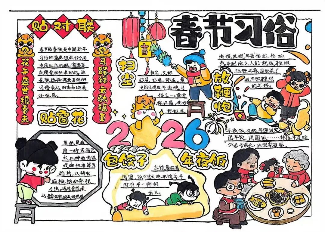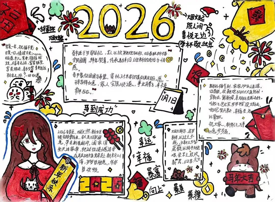 骏马踏春至,少年奋蹄时! “马”象征着奔腾不息、勇往直前的精神,正如你们在成长的道路上蓄势待发、勇敢前行。假不仅是休息放松的时光,更是我们成长与进步的契机。为深入贯彻“双减”政策,践行“立德树人”理念,南昌县墨山街小学精心策划了以“德、智、体、美、劳”全面发展为核心,饱含趣味、充满体验的寒假德育实践作业。同学们通过搜集节日资料,学习节日文化,深入了解春节的来历、习俗等,编创出了内容丰富,色彩艳丽,形式多样的节日小报。通过编创节日小报,同学们展示了自己的节日收获和感悟,加深了对中国传统文化的理解,感受到了祖国传统文化的博大精深!下面让我们一起来看看吧!