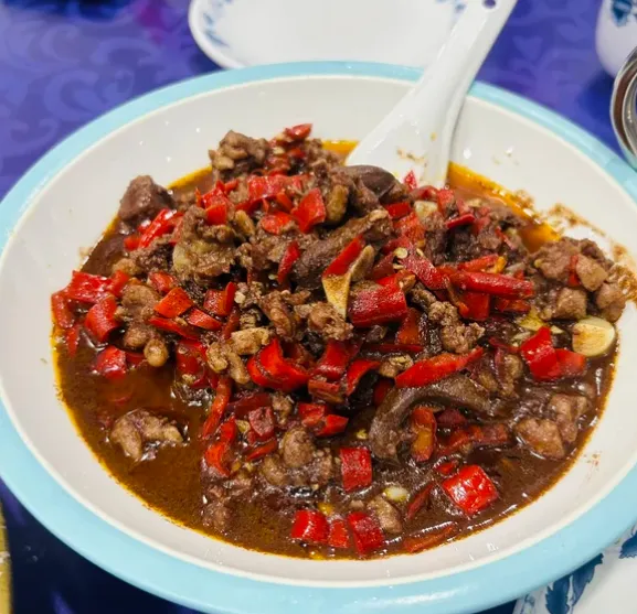 如果只选一道代表菜,我会给莲花血鸭。做法不复杂:仔鸭切块先煸出油,下姜蒜和本地辣椒炒香,再加鸭血快速翻匀,让血汁裹在鸭肉表面,最后收汁起锅。成菜颜色深亮,入口先是鲜,再是辣,骨头缝里都带香。