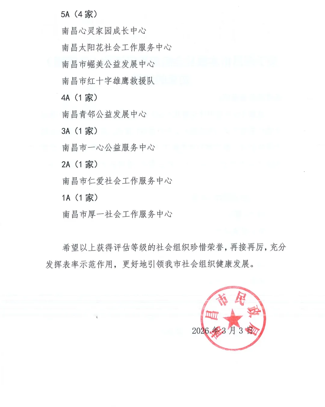 近日,南昌市民政局发布南昌市本级社会组织等级评估(第四期)结果通报,南昌市崛美公益发展中心成功获评5A 级民办非企业单位。