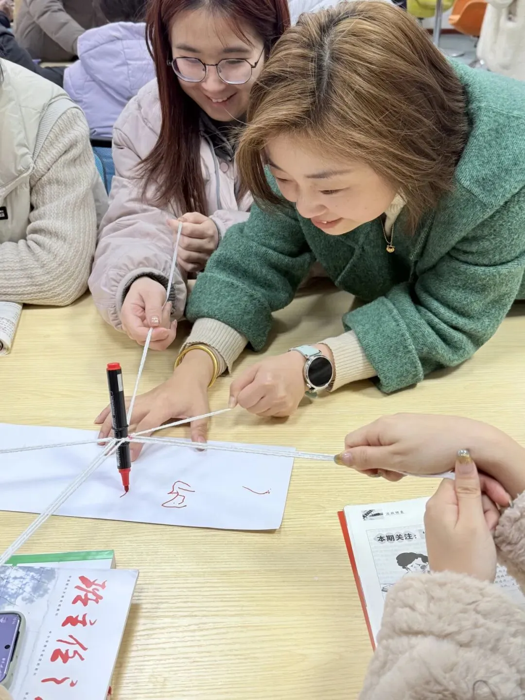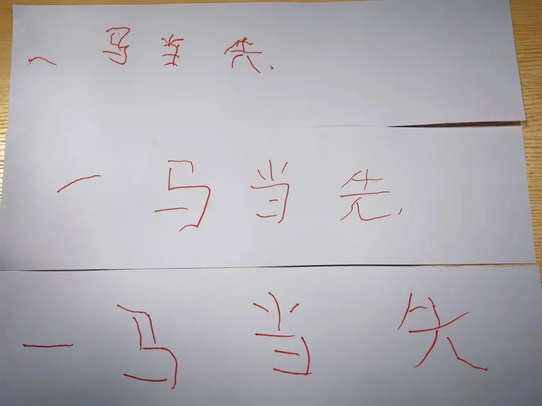 “神笔马良”考验着团队的默契与配合。老师们共同牵拉细绳,凝神聚力、协同书写,其中三年级组的班主任们心有灵犀,默契选择书写“一马当先”,一笔一画间,既尽显同心同向的力量,也寄托了新学期奋勇争先的美好期许。