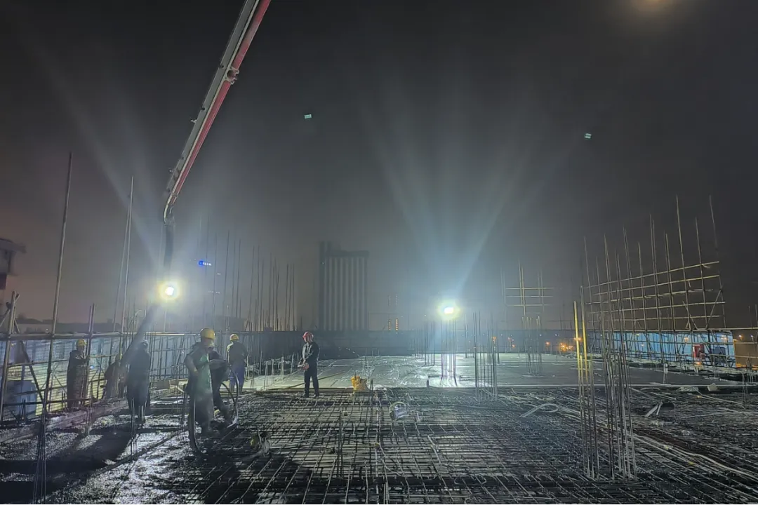 自项目开工以来,城建实业公司始终秉持“匠心筑精品”的理念,科学组织施工,严控进度质量。面对春季多变的气候条件,项目团队提前谋划、精准施策,优化施工流程,强化现场管理,确保混凝土浇筑质量过硬、安全可控。全体建设者以“起步即冲刺、开局即决战”的奋斗姿态,日夜兼程、接续奋战,用实干和汗水推动项目跑出“加速度”。