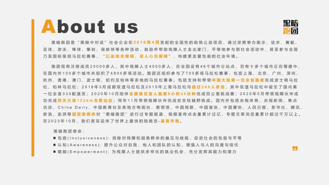 黑暗跑团是"黑暗中对话"在2016年4月发起的全国性的残障公益陪跑项目,旨在鼓励并帮助残障人群走出家门,在平日举办残障陪跑、徒步、赛艇、足球、骑车、和游泳等例行活动,为残障跑者寻找合适的陪跑员,参与全国范围乃至国际级别的马拉松等赛事,强身健体,让他们平等地参与到主流活动当中,并通过建立陪跑者与残障跑者沟通的渠道,改变社会对残障群体的偏见与歧视,“以运动无障碍,促人心无障碍”。
