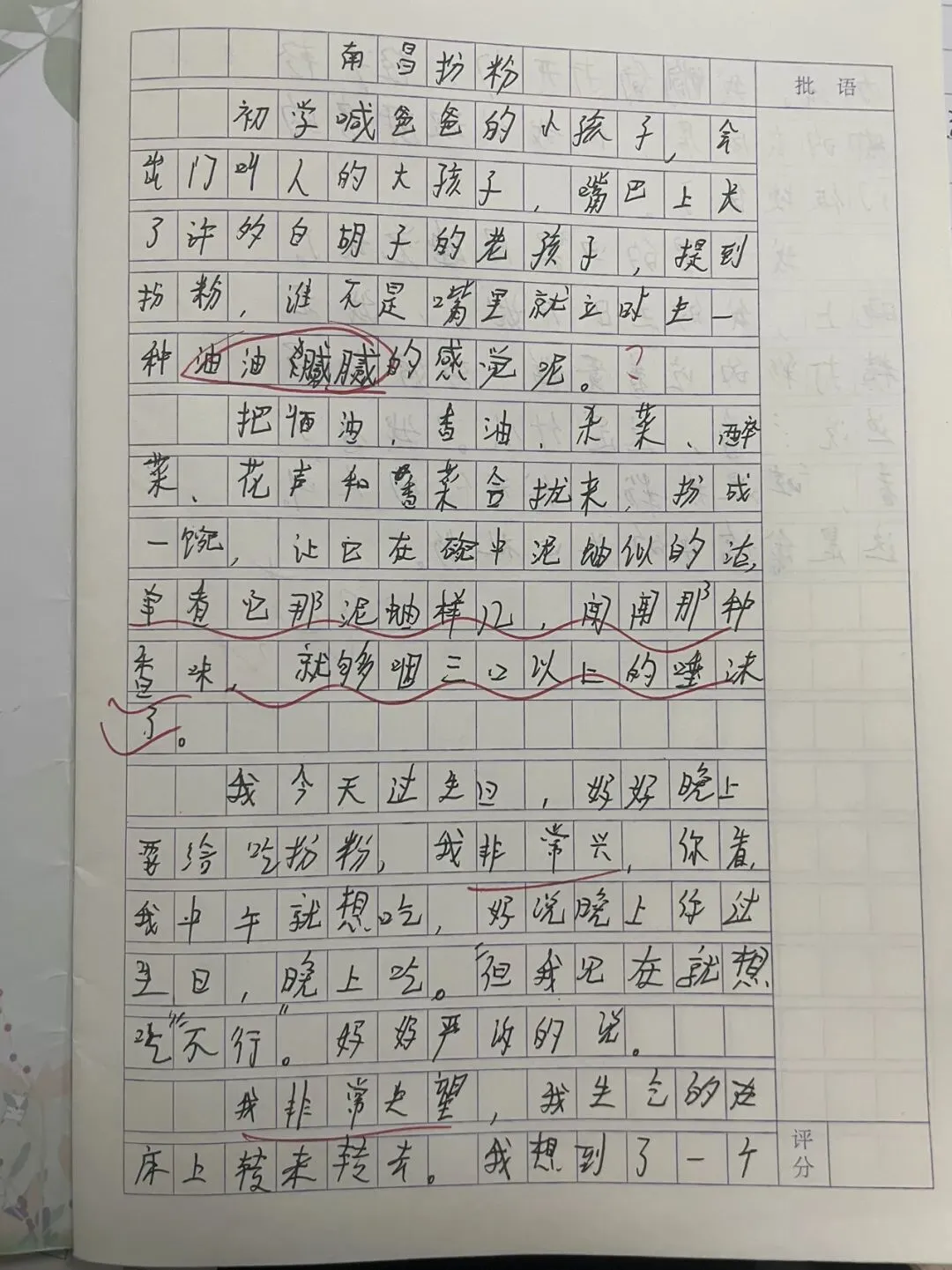 读了你写的《南昌拌粉》,我眼前一亮!你的文章有一个非常特别的亮点——用生日的期待和“小插曲”来写美食!偷偷溜进厨房发现门被锁了,这个细节太真实、太可爱了,一看就是你亲身经历的。还有一看就知道是在模仿我们学过的《腊八粥》经典开头,你学会举一反三了,真棒!修改对比
