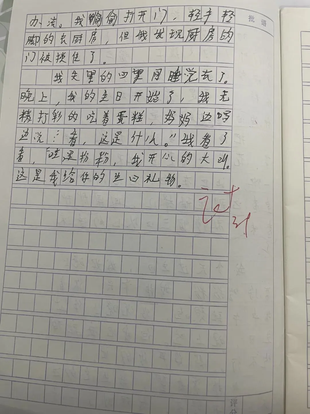你在这篇习作中已经很好地运用了“情感三步曲”——盼的急切、转的失望、喜的感动,都有了!特别是偷偷溜进厨房发现门锁了这个细节,太真实了,这是你的独家记忆,别人想编都编不出来!继续加油,期待你写出更多有真情实感的好文章!