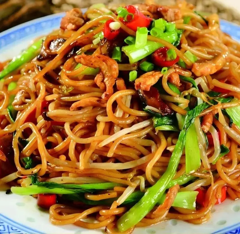 炒粉:本地晚米细粉,配五花肉、鸡蛋、青菜,猛火快炒,酱香带辣、粉弹不粘