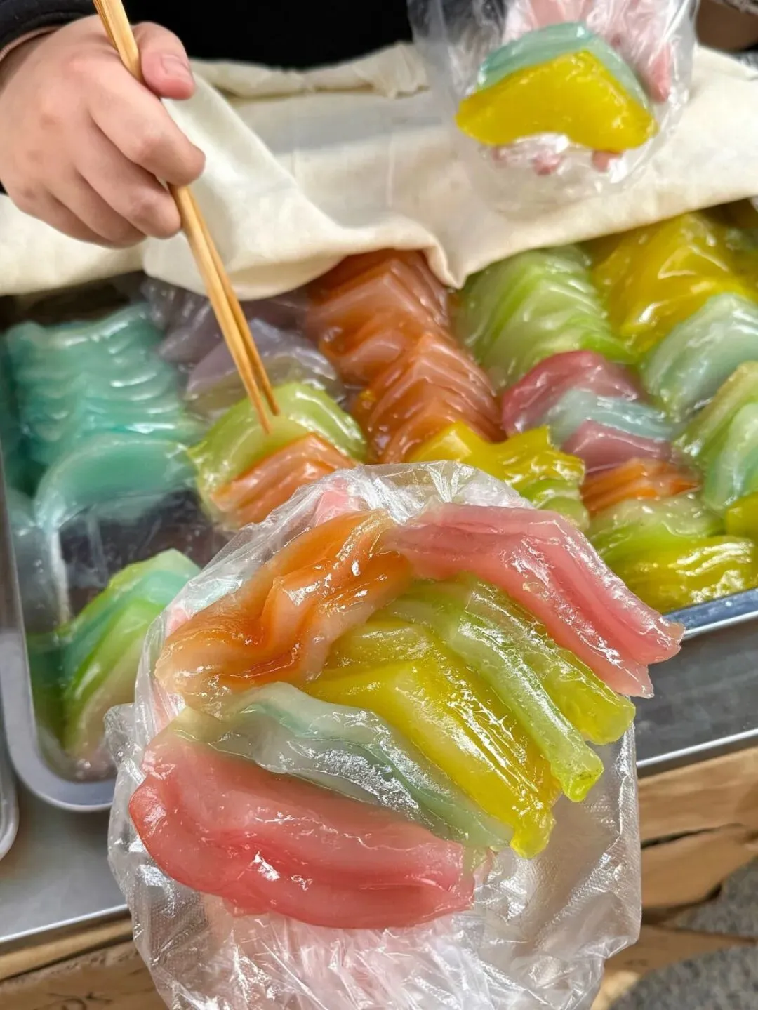 白凉粉 + 冰糖水 + 果汁 / 薄荷汁制成,常见颜色有薄荷绿、橘子橙、水蜜桃粉、菠萝黄等,多切成均匀方块,码在透明塑料盘 / 玻璃盒里,冰镇后晶莹透亮,1 元一块,是南昌夜市、校门口的经典怀旧小吃。