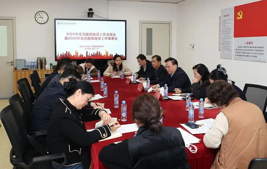 为全面贯彻落实党的二十大、二十届四中全会及二十届中央纪委五次全会、省纪委十五届六次全会精神,纵深推进医院党风廉政建设工作,2026年3月11日,南昌大学第二附属医院召开2025年党风廉政建设工作总结暨2026年党风廉政建设工作部署会,医院党委书记程学新、党委副书记曾洁华和纪委书记王晓辉出席会议。会议由党委副书记曾洁华主持。