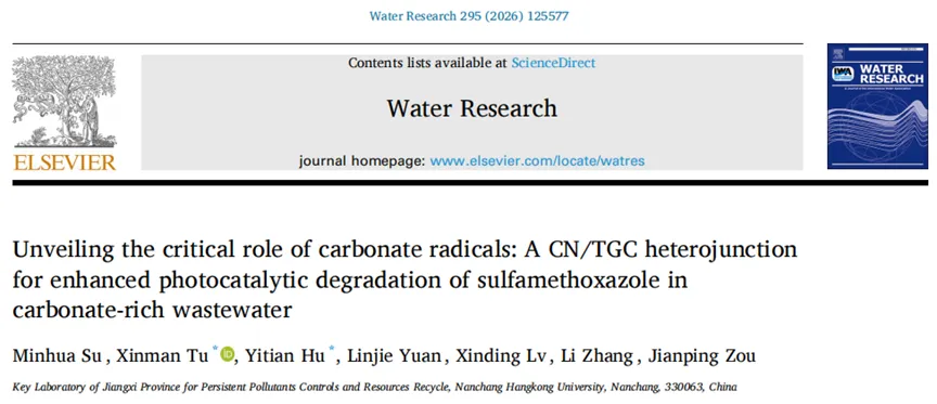 Unveiling the critical role of carbonate radicals: A CN/TGC heterojunction for enhanced photocatalytic degradation of sulfamethoxazole in carbonate-rich wastewater. Minhua Su, Xinman Tu*, Yitian Hu*, Linjie Yuan, Xinding Lv, Li Zhang, Jianping Zou. Water Research