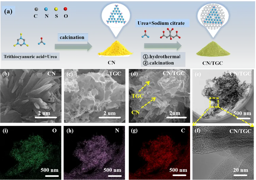 图 1. (a) CN/TGC 制备流程示意图。(b-d) CN、TGC 和 CN/TGC 的 SEM 图像。(e) CN/TGC 的 TEM 图像。(f) CN/TGC 的 HRTEM 图像。(g-i) CN/TGC的 EDX 元素映射图像。