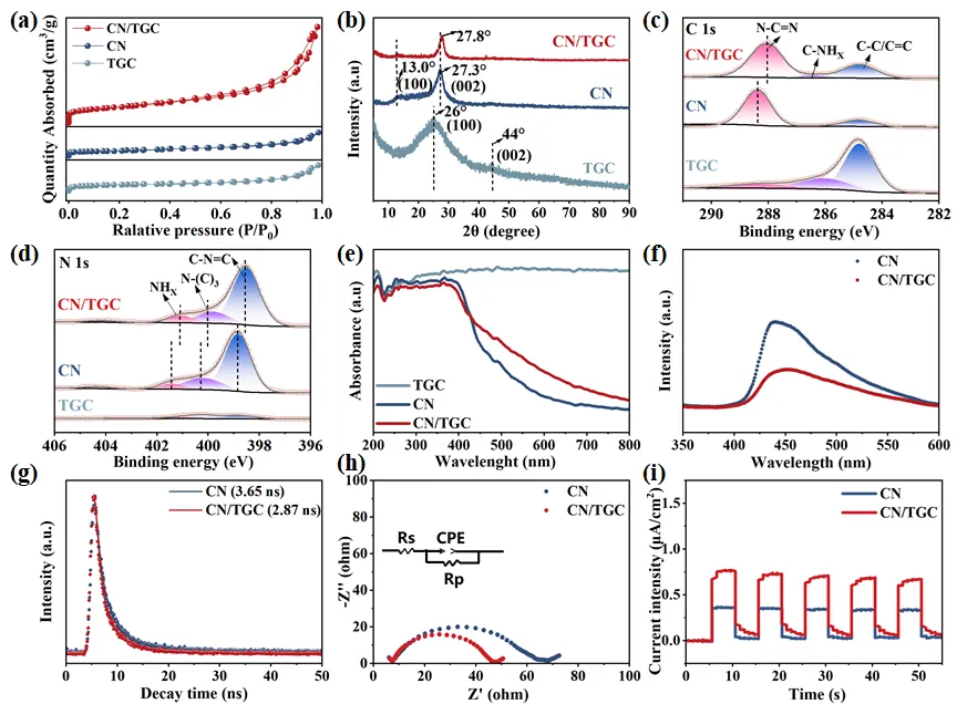 图 2. (a) TGC、CN 和 CN/TGC 的氮气吸附-脱附等温曲线。(b) XRD 图谱。(c-d) TGC、CN 和 CN/TGC 的高分辨率 XPS 光谱 C1s 和 N1s。(e) TGC、CN 和 CN/TGC 的紫外-可见漫反射光谱。(f-g) CN 和 CN/TGC 样品的 PL 光谱和TR-PL光谱。(h-i) CN 和 CN/TGC 样品的 EIS 奈奎斯特图和瞬态光电流响应。