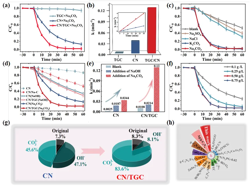 CN/TGC在含碳酸盐废水中具有良好的降解性能,且通过图(c-d)排除了其他阴阳离子和pH的贡献,证明了CN/TGC降解中,CO₃²⁻是促进反应主要因素,如图(g)。