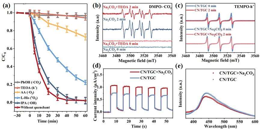 图 4. (a) CN/TGC 在模拟含碳酸根废水中的自由基捕获实验。(b) CN/TGC 在不同测试条件下的 EPR 谱图。(c) CN/TGC 在添加/不添加 Na2CO3 时的 EPR 谱图。(d-e) CN/TGC 在添加/不添加 Na2CO3 时的光电流和 PL 谱图。
