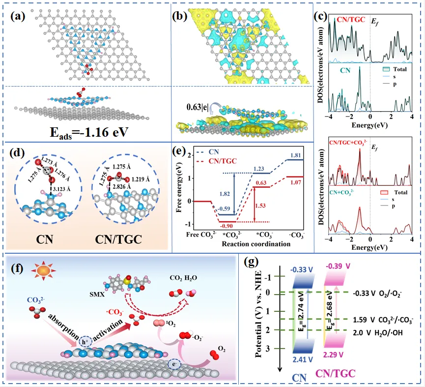 图 5. (a) CO₃²⁻在 CN/TGC 表面吸附的优化结构。(b) CN/TGC 的差分电荷密度图,其中黄色区域代表电荷积累,青色区域代表电荷耗尽。(c) CO₃²⁻在 CN 和 CN/TGC 上吸附的态密度(DOS)对比。(d) CO₃²⁻吸附在 CN 和 CN/TGC 上的吸附构型。(e)在 CN 和 CN/TGC 上 CO₃²⁻还原成·CO₃⁻的自由能图比较。(f) CN/TGC 体系中有机污染物降解示意图。(g) CN 和 CN/TGC 的能级图。