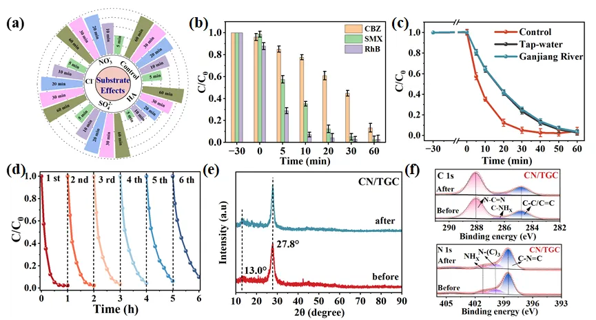 图 6. (a) 在含不同阴离子的模拟含碳酸根水体环境中,CN/TGC 对 SMX 的降解情况。(b) 在模拟含碳酸根废水中,CN/TGC 对多种不同有机污染物的降解。(c) 不同水体基质对 SMX 降解效率的影响。(d) CN/TGC 在模拟含碳酸根废水中降解 SMX 的稳定性测试。(e) CN/TGC 催化反应前后的 XRD 图谱。(f) 降解反应后的 XPS 图谱:C 1s,N 1s。