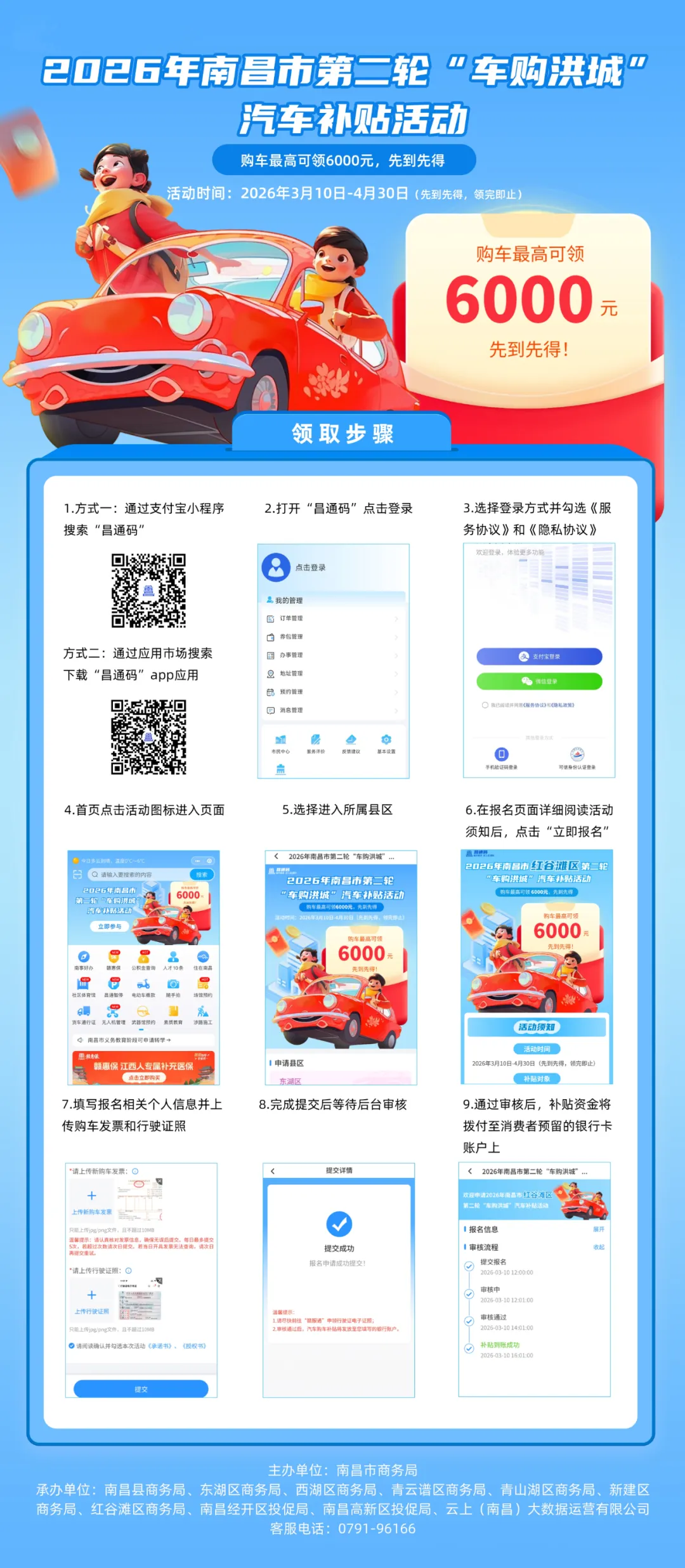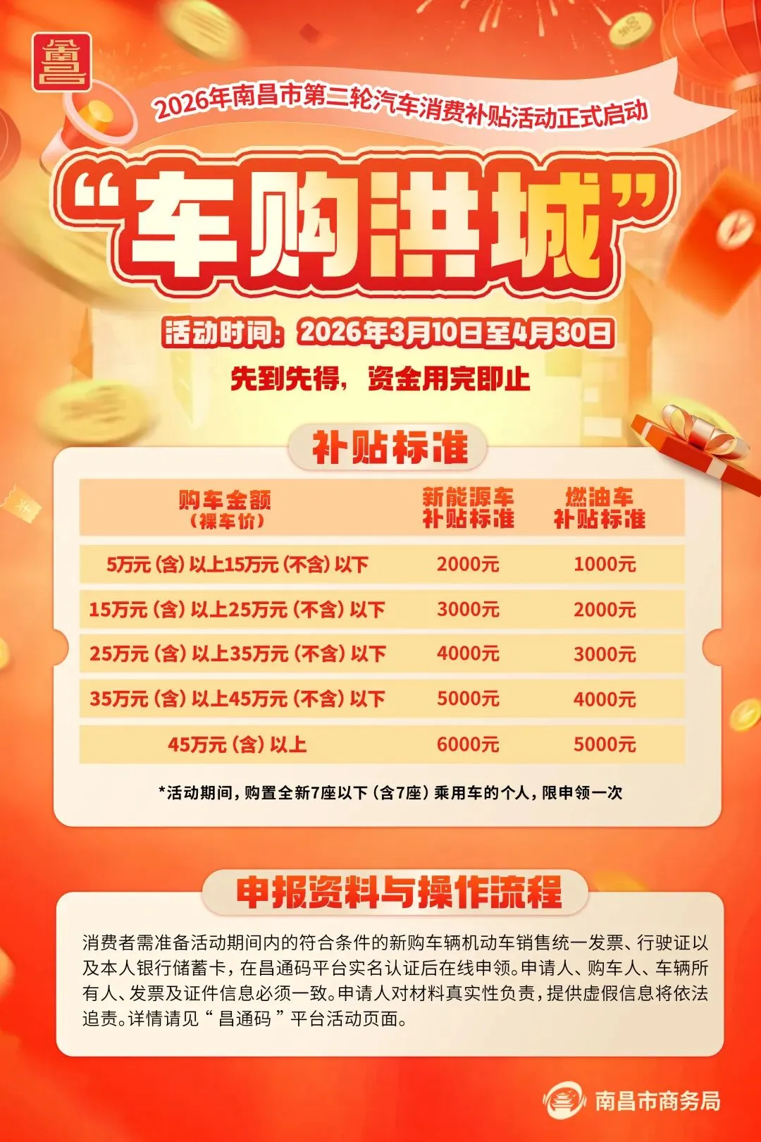 为进一步满足市民购车需求,经研究决定,于2026手3月10日提前结束第一轮“车购洪城”汽车补贴活动,2026年1月24日—3月10日期间(以购车发票时间为准),在南昌县、东湖区、西湖区、南昌经开区参与第一轮“车购洪城”汽车补贴活动的汽车经销企业购车,符合补贴申领条件,已取得申报材料的个人消费者,应于2026年3月16日前在昌通码第一轮“车购洪城”汽车补贴活动申报端口上传所有材料,提交补贴申请,逾期未提交的,视为自动放弃补贴。