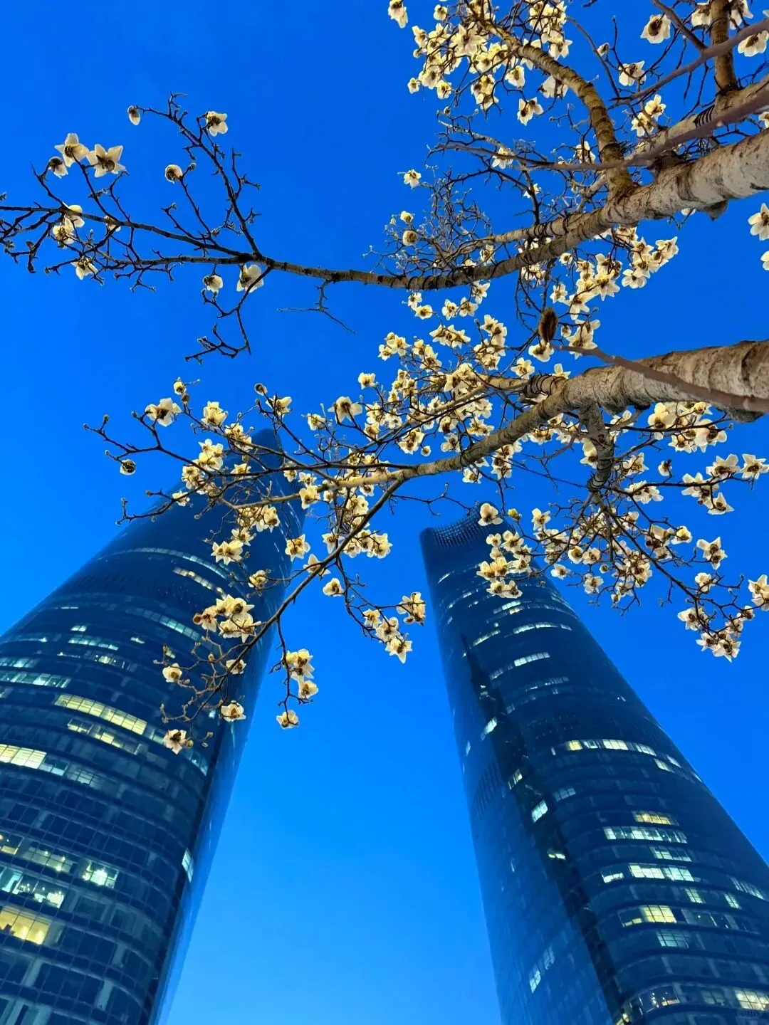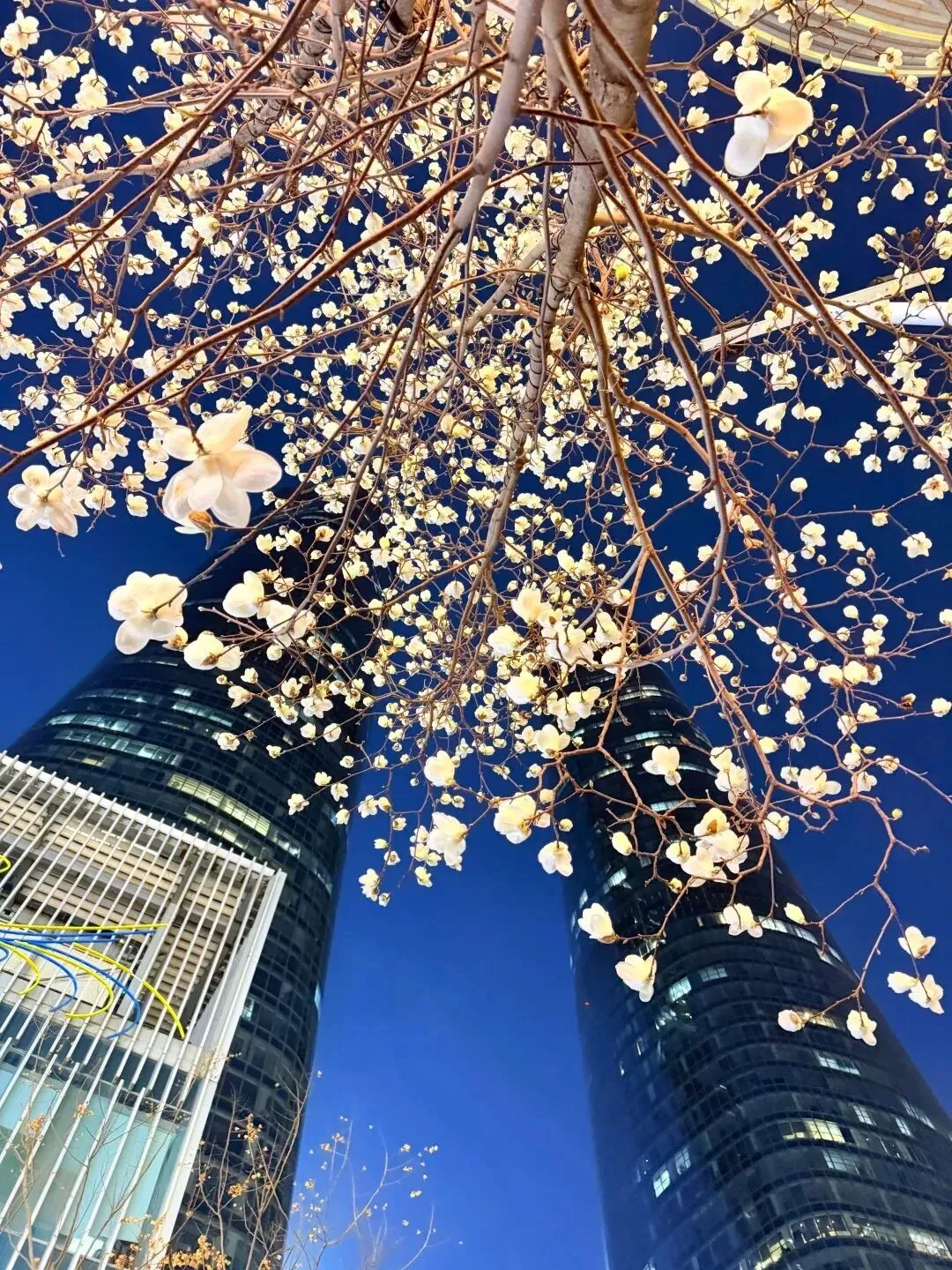 白天看已经够美了但傍晚天色慢慢暗下来双子塔的灯光一层层亮起那些洁白的玉兰花在高楼大厦的映衬下在夜空和灯光的包裹里白得发亮 白得耀眼