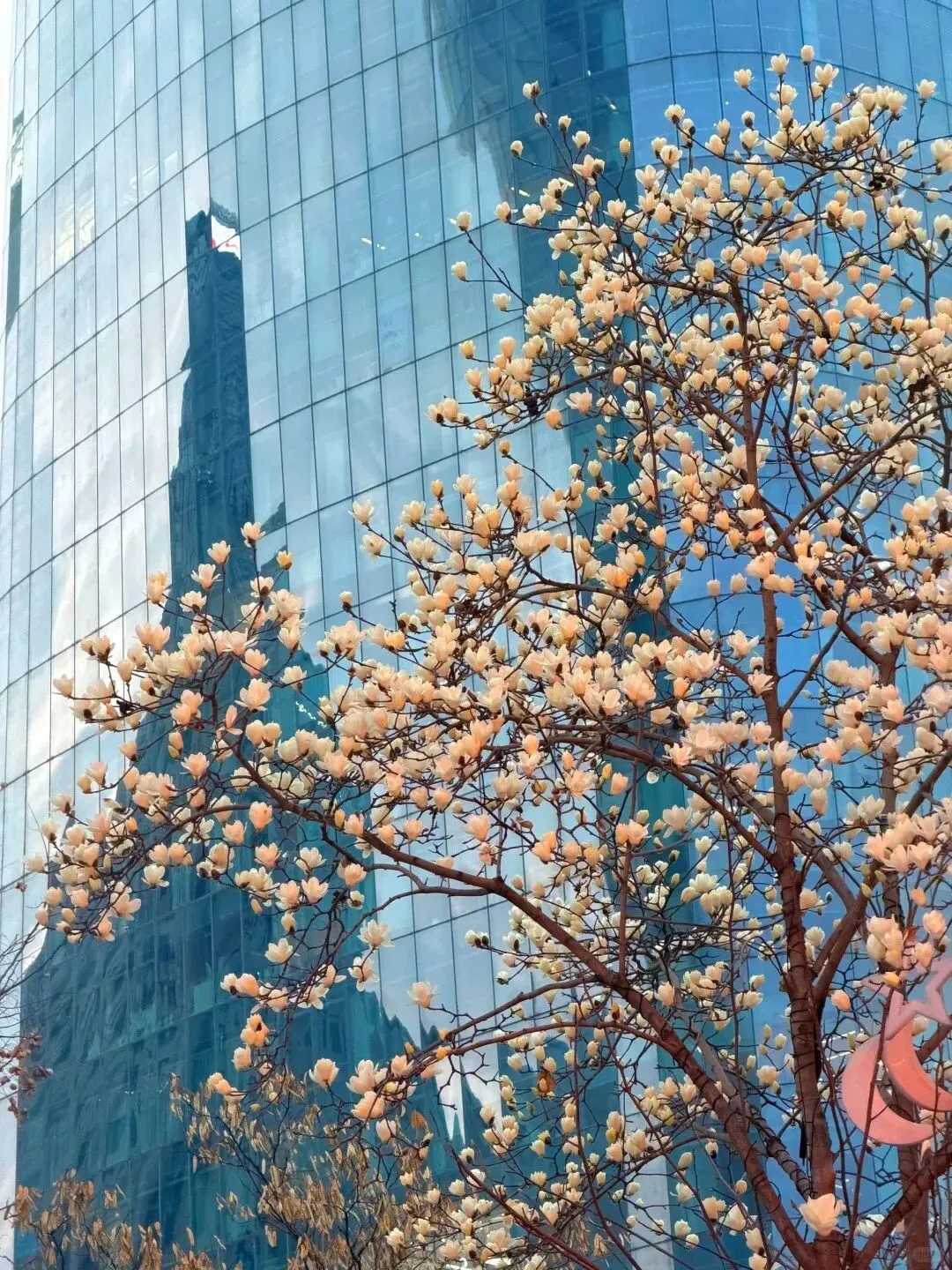 双子塔下一排玉兰花开得正好不是那种羞羞答答的小花苞是大朵大朵的白在枝头开得舒展又坦荡