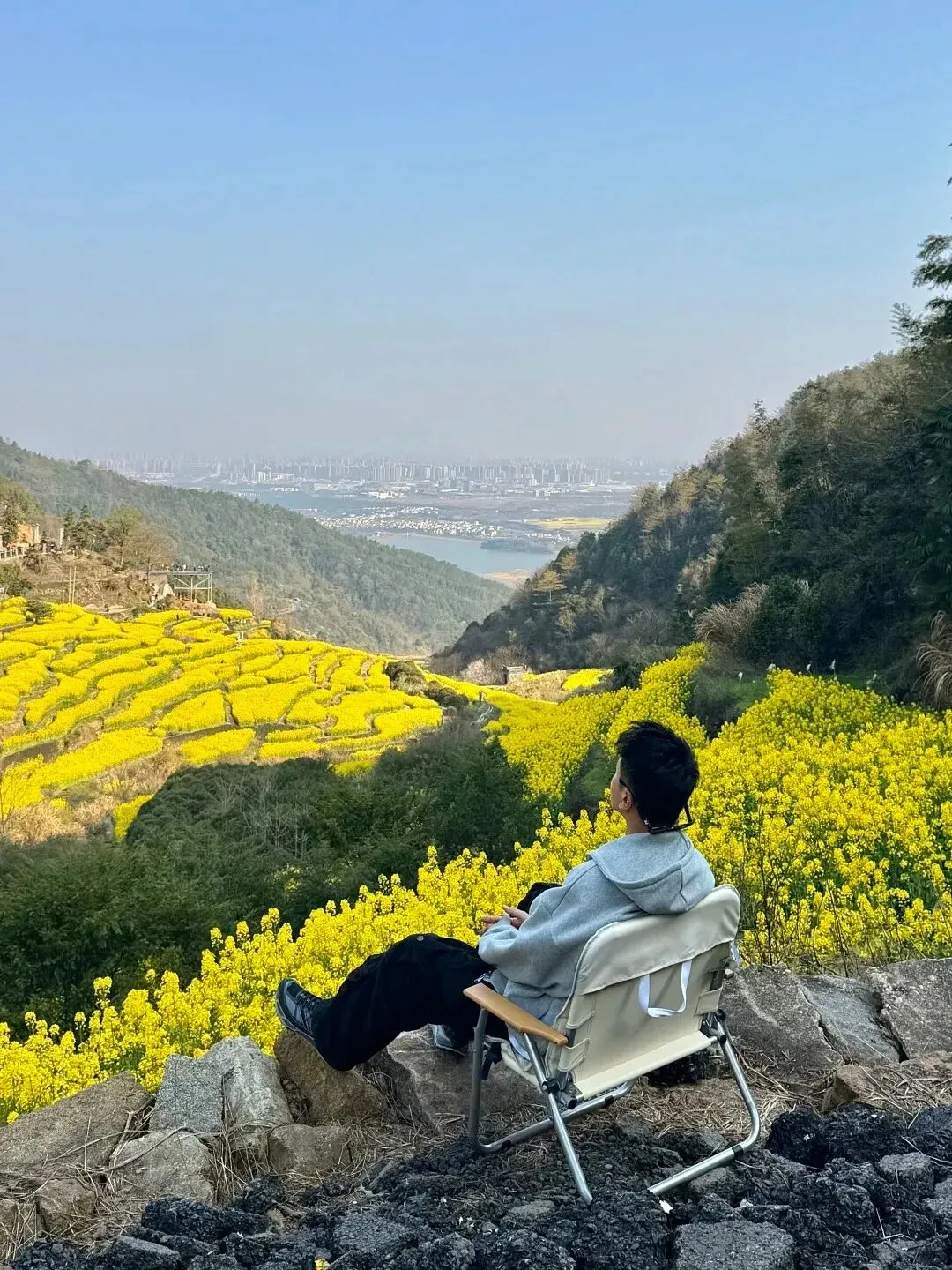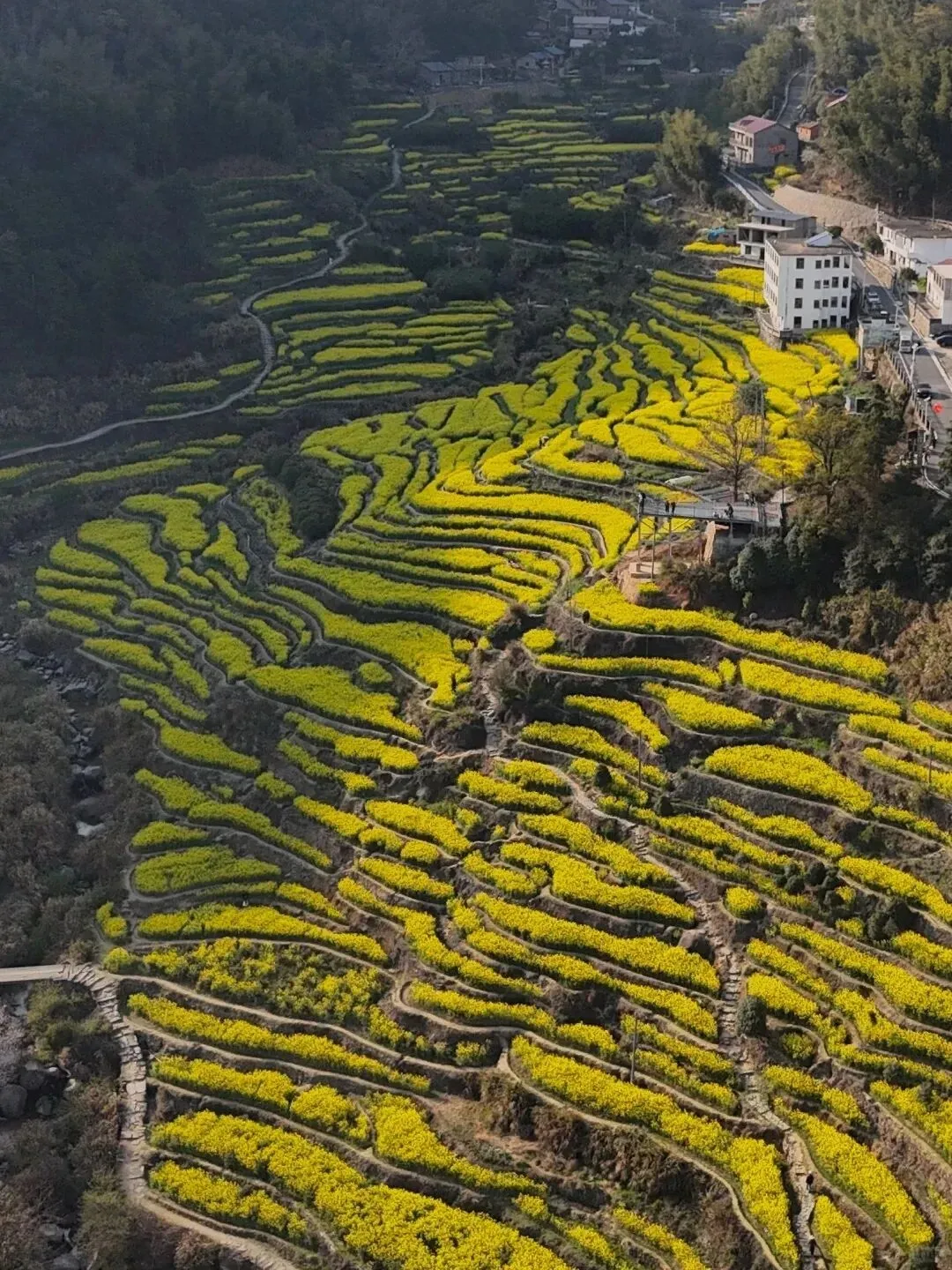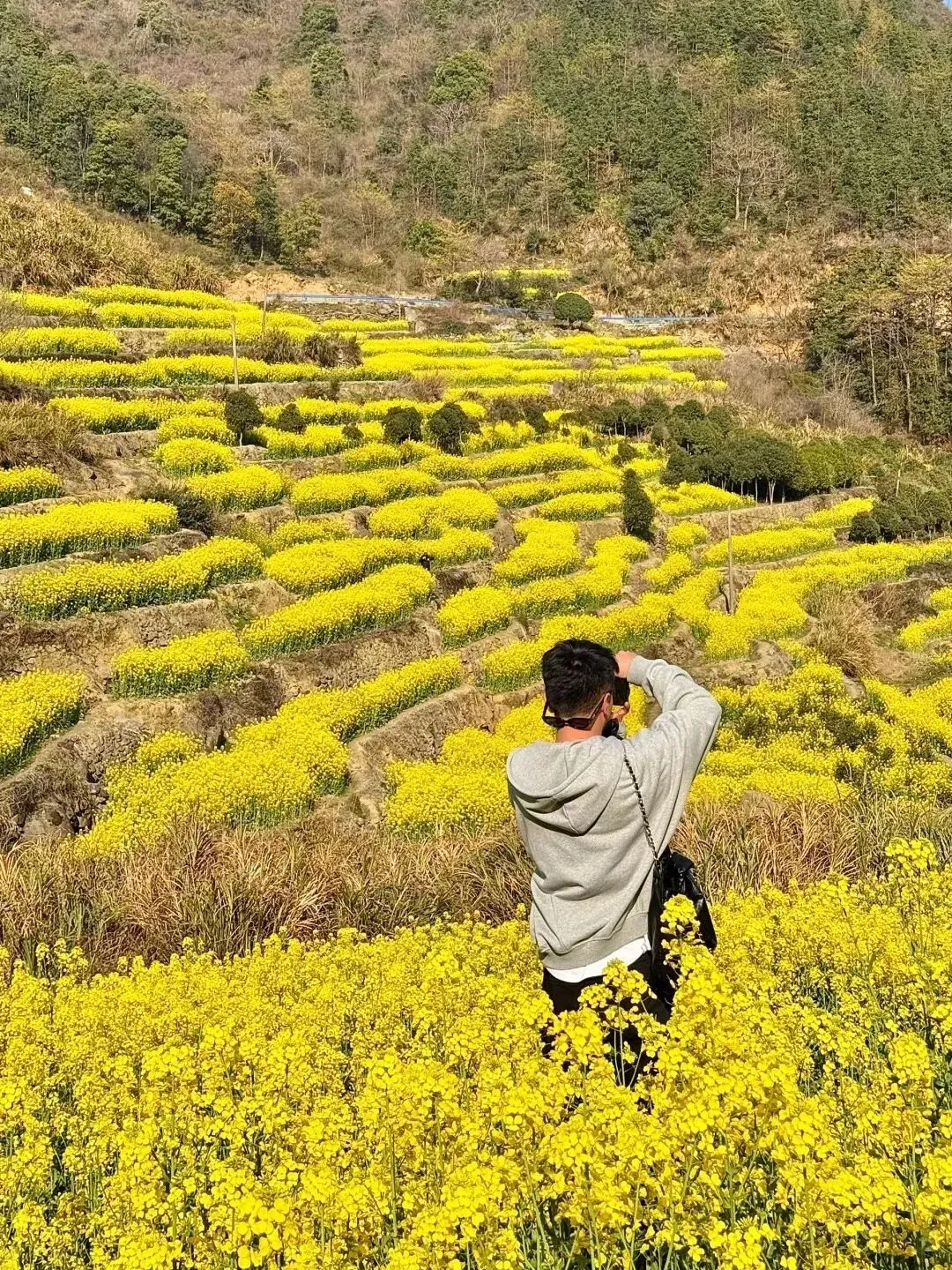 后面是墨绿色的山林前面是层层叠叠的金色花田偶尔有鸟从头顶飞过偶尔有风吹动花枝原生态的感觉没有喧哗 只有你和春天