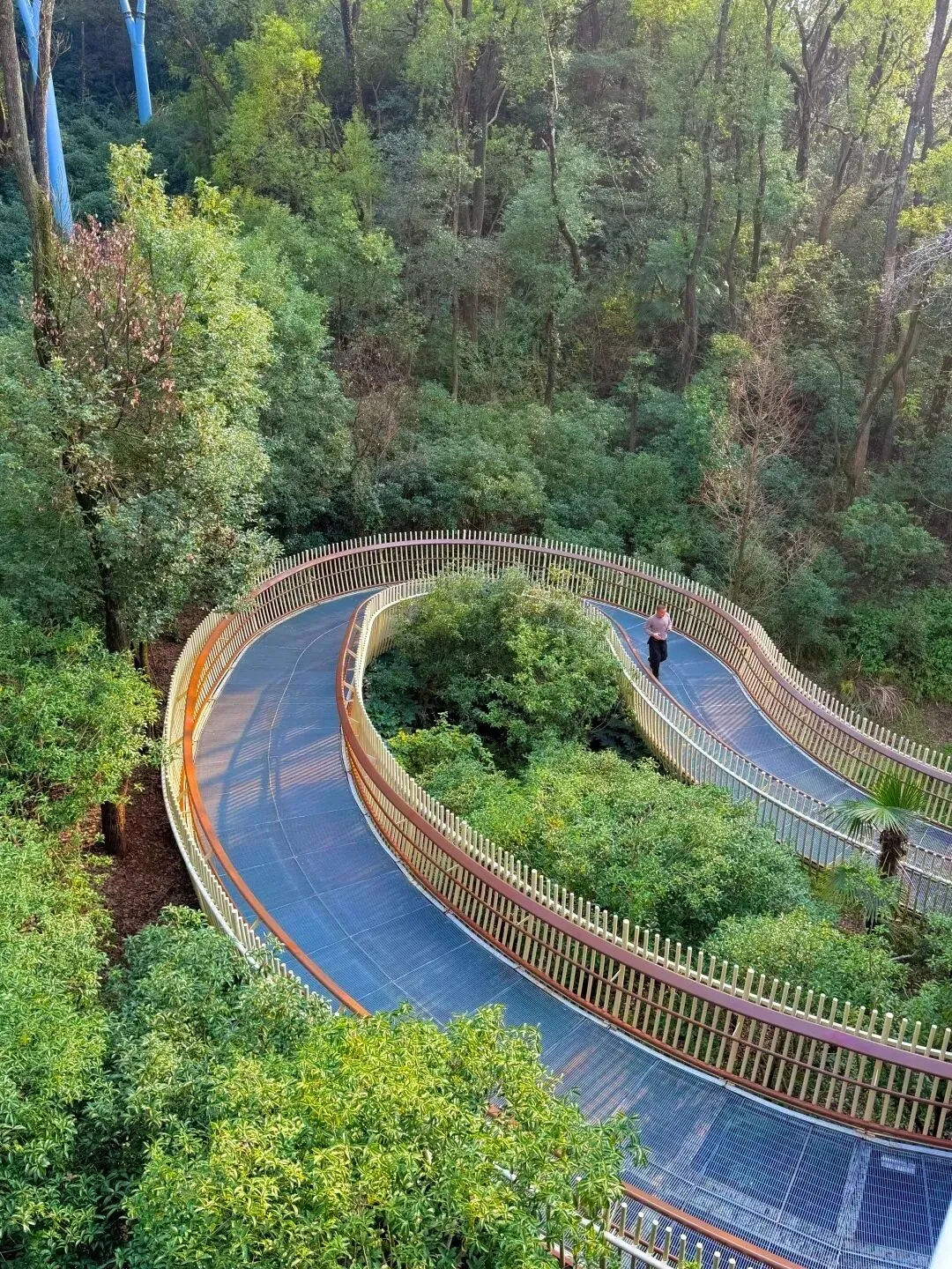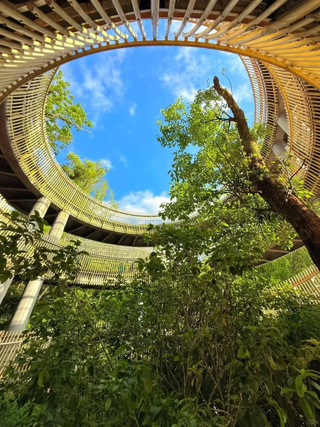 这里有一条很长很长的空中步道架在树林中间走在上面像是踩着树梢穿行脚下是刚刚冒出的新绿头顶是斑驳跳跃的阳光风从耳边吹过带着泥土和青草的味道