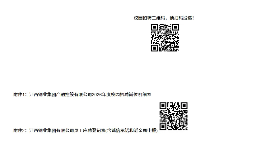 (3)应聘者可通过前程无忧、猎聘,查看相关岗位要求,按照指引,前往集团官网及集团招聘公众号扫描二维码进行投递,外部招聘网站仅作为岗位发布推广途径,以江铜官网收到的简历为唯一有效途径。