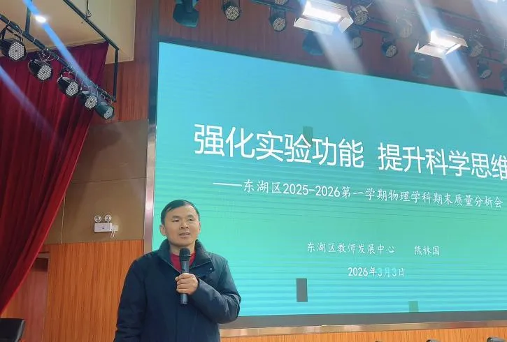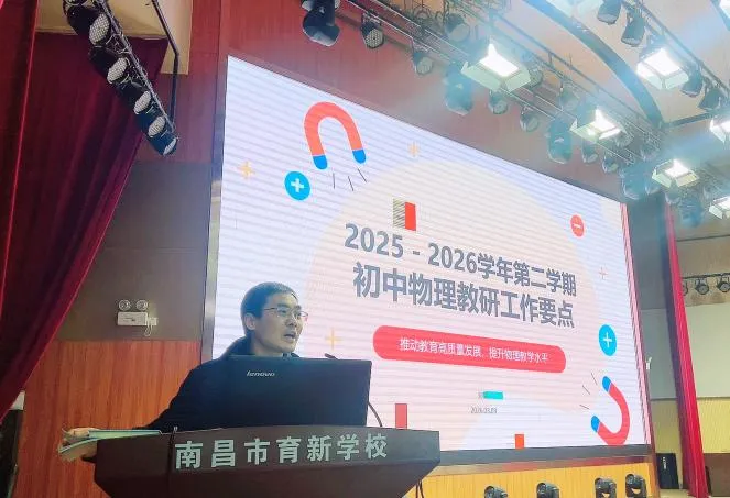 为推动南昌市初中物理教育高质量发展,明确新学期教研工作方向,促进教师专业素养与教学能力提升,2026年3月3日,南昌市初中物理新学期工作布置会暨“洪城慧研书院”阅读写作分享、命题坊活动在南昌市育新学校教育集团二七北路校区顺利举行。本次活动由南昌市育新学校教育集团二七北路校区执行校长曹昌华主持,全市初中物理教师齐聚一堂,共研教学新思路,共话教研新发展。