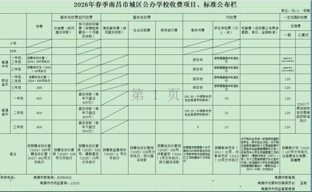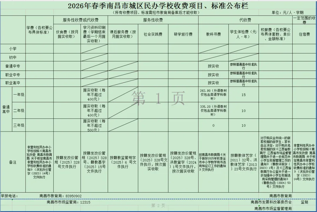 2026年春季南昌市城区公办学校收费项目、标准公布栏