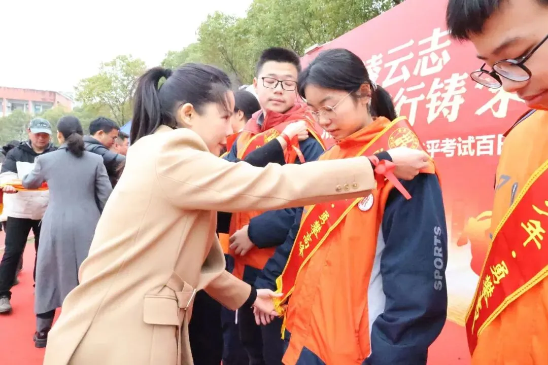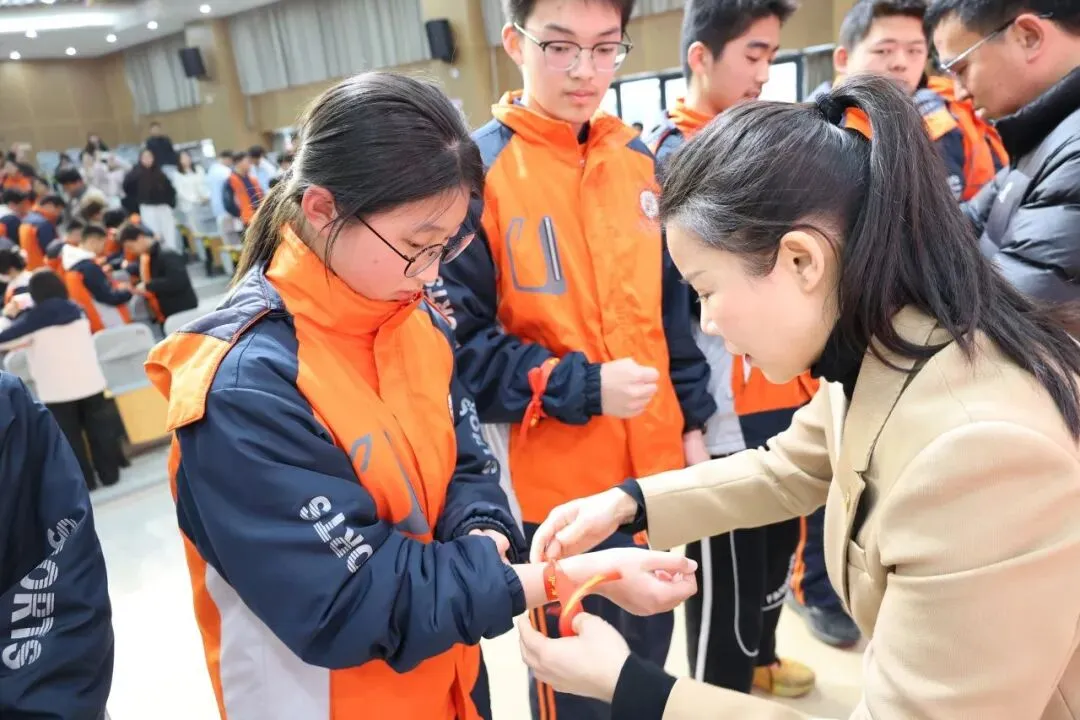 在领导·授带鼓励环节中,学校领导手持印有“洪州少年·勇攀高峰”的励志授带,走进学生队伍,为各班优秀学子代表逐一佩戴授带,以仪式感传递期许、以鼓励点燃斗志,激励全体学子坚定信念、奋勇争先、逐梦前行。