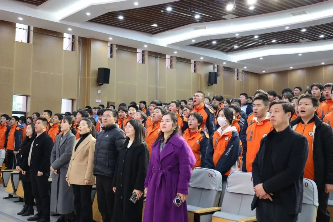 活动在学生相互佩戴手环中拉开序幕,主持人再以豪迈、热血的话语开场,带领全场高呼活动主题“少年振翼凌云志 热血笃行铸荣光”,随后全体师生齐唱国歌,在庄严的旋律中,让学子将个人梦想与家国情怀相融,坚定“为梦想而战”的信念。