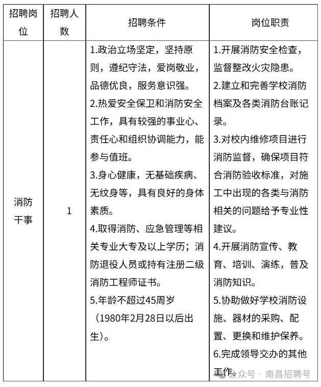 声明:本微信公众号刊载此文,无任何商业目的,目的是架起求职者和用人单位之间的桥梁,传递更多的招聘就业信息。若来源标注错误或侵犯了您的合法权益,请及时与我们联系,我们将及时更正、删除或依法处理,微信号(含:商务合作):xiongcairenli 江西管理职业学院是一所经江西省人民政府批准、教育部备案,由江西省教育厅直属管理的公办全日制普通高等职业院校。根据学院事业发展需要,现面向社会公开招聘1名劳务派遣制消防干事。