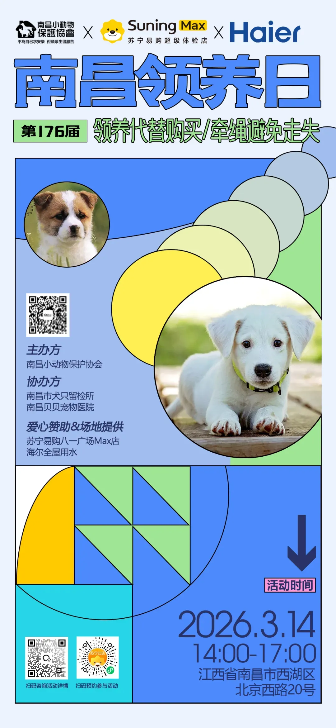 周六(3月14日)下午,我们将携手「苏宁易购八一广场Max店(内场)」,共同举办第176届·「南昌领养日」。