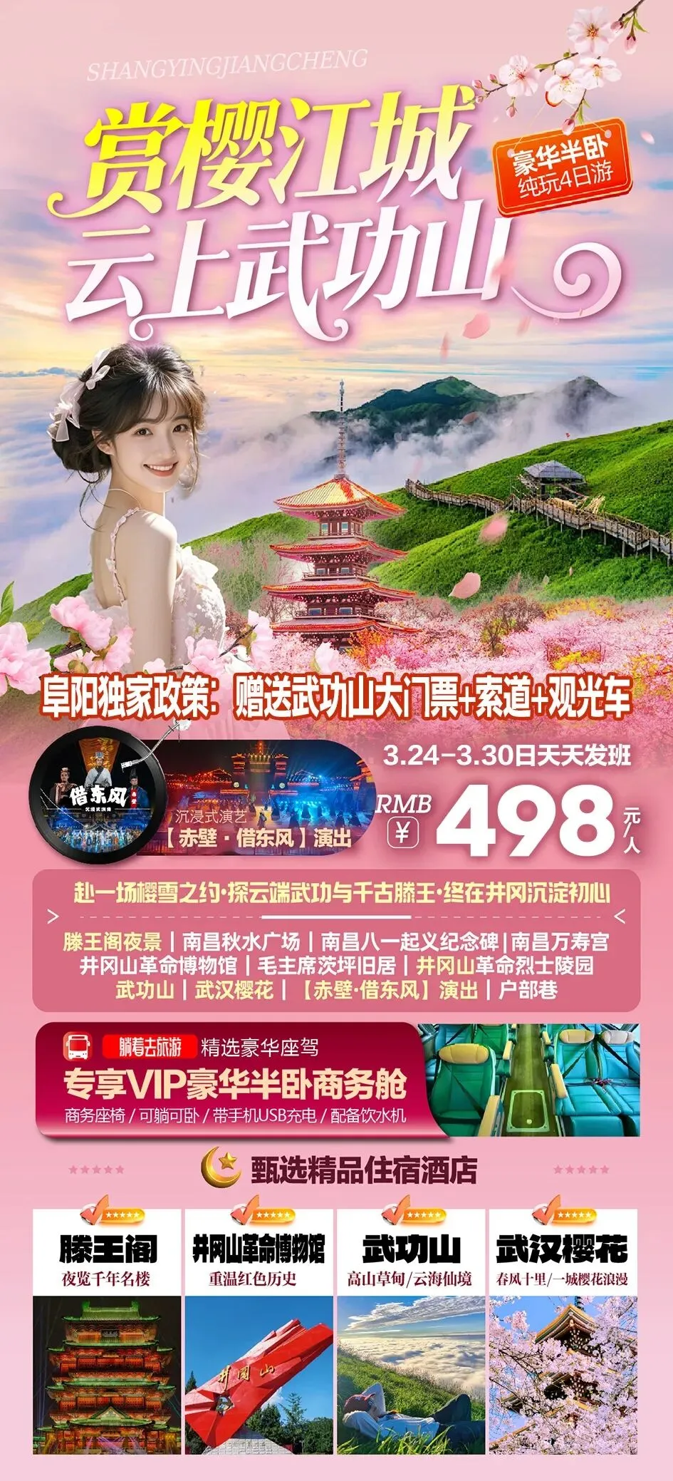 ①漫步武汉全城花海,打卡50万株樱花盛景,在汉口江滩或西北湖公园欣赏"晴川吹雪"的浪漫春日②探访革命圣地【井冈山】参观井冈山革命纪念馆与毛泽东同志茨坪旧居,瞻仰井冈山革命烈士陵园③登顶【武功山】海拔约一千九百米的江西第一高峰,漫步10万亩高山草甸,观赏云海日落奇观④夜游中国古代四大名楼之一【滕王阁】欣赏琼楼幻彩的夜景,感受"西江第一楼"的浪漫旖旎⑤打卡南昌【万寿宫】这座千年道观供奉着江西最强"锦鲤天团",专治各种水逆不服⑥游览武汉【户部巷】这条"汉味小吃第一巷"汇集了武汉所有值得一试的特色小吃⑦漫步【秋水广场】与名振天下的滕王阁隔江相望,感受依《滕王阁序》名句命名的浪漫氛围⑧体验三国文化沉浸式演艺【赤壁·借东风】,高燃还原赤壁之战的智略筹谋与英雄气魄.