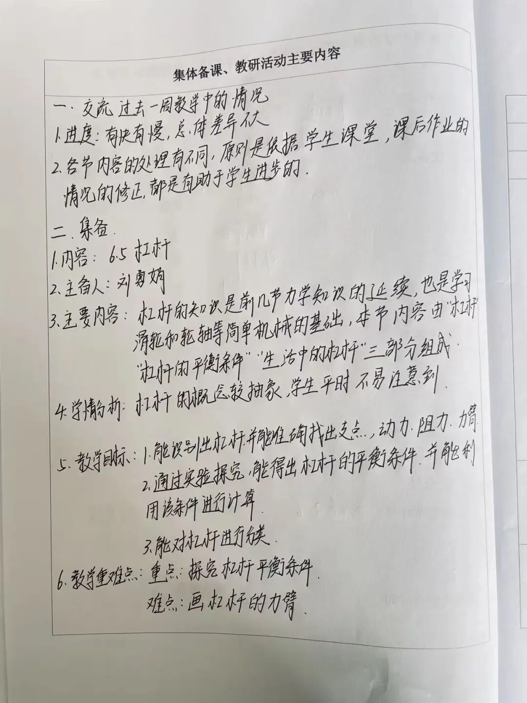 本次集体备课的核心内容为八年级物理《6.5 杠杆》。主备人刘勇娟老师从教材地位、学情分析、教学目标及重难点等方面进行了详细阐述: