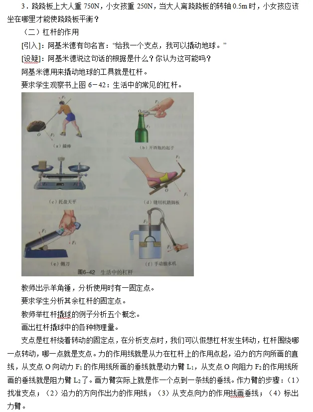• 教材地位:杠杆知识是力学知识的延续,也是后续学习滑轮、轮轴等简单机械的基础,本节内容由“杠杆”“杠杆的平衡条件”“生活中的杠杆”三部分构成,承上启下作用显著。