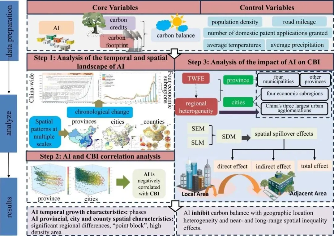 AI作为数字经济核心驱动力,其在产业升级、资源配置优化中的作用备受关注。然而,AI的发展也带来高能耗、高土地占用等问题,对碳中和形成潜在压力。现有研究多聚焦AI的单一环境效应,缺乏将碳排放与碳汇纳入统一框架的系统分析。尤其在中国这样一个区域发展不平衡、产业结构差异显著的国家,AI对碳平衡的影响是否具有空间异质性?其空间溢出效应如何?这些问题亟待回答。
