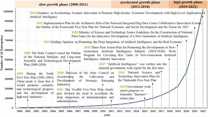 图3 2000–2022年中国AI企业数量、政策实施及阶段