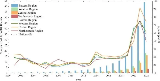 图4 2000年至2022年中国及四大经济区人工智能企业的总数量及增长率
