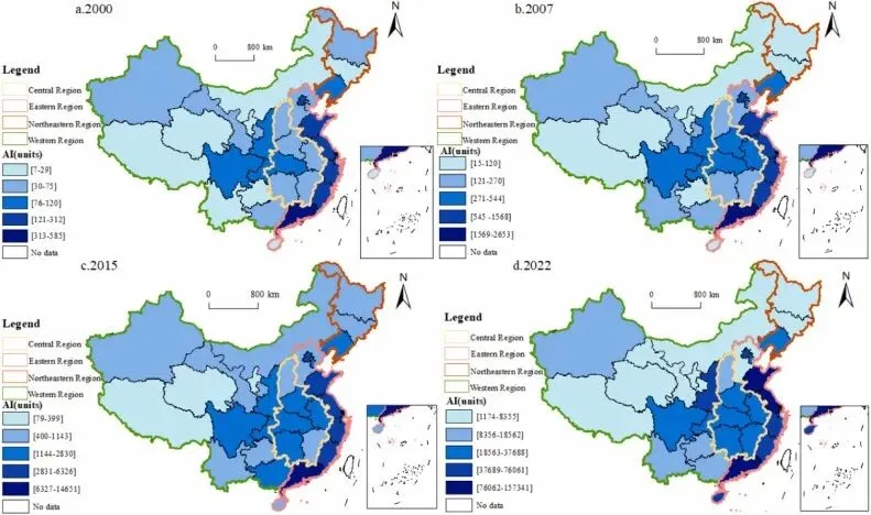 图7 2000–2020年中国县域人工智能的空间和时间演变趋势