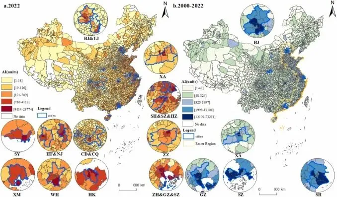 整合多源数据(卫星遥感、企业注册、社会经济、自然数据),构建多尺度(省、市、县)AI时空演变格局;