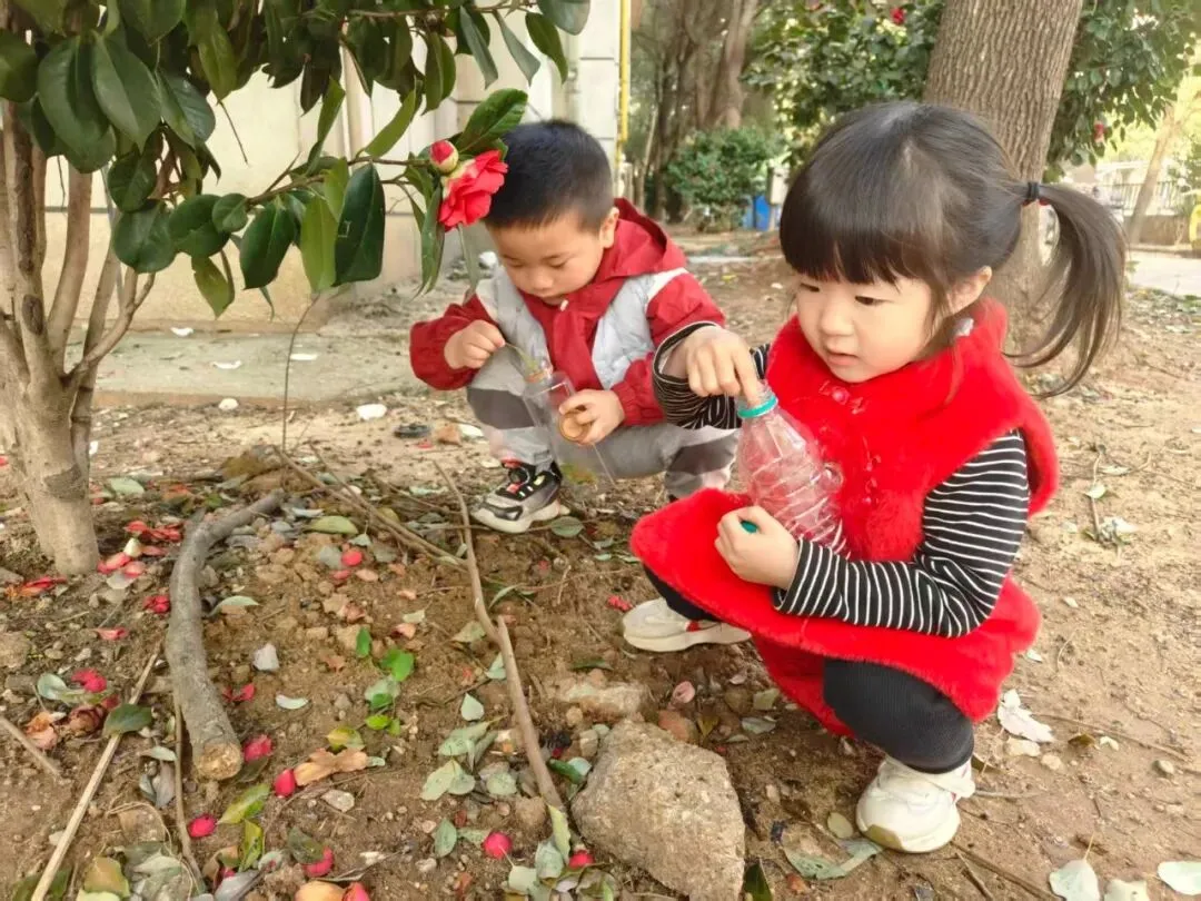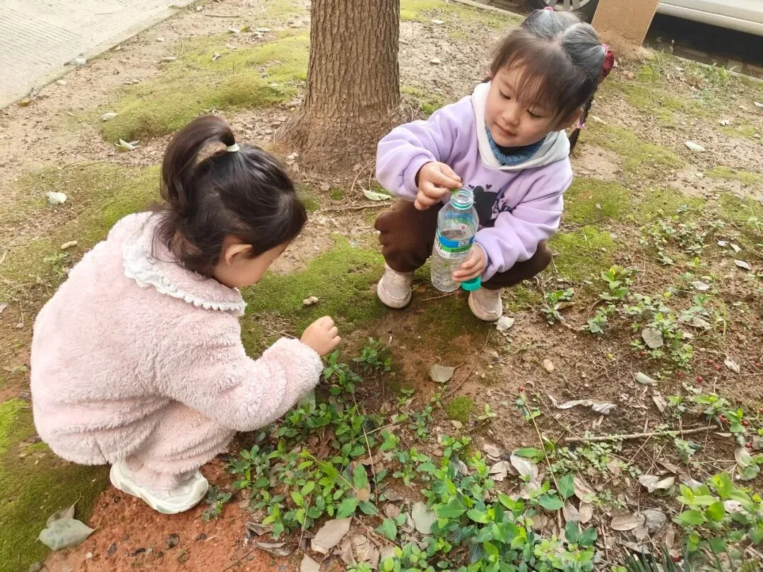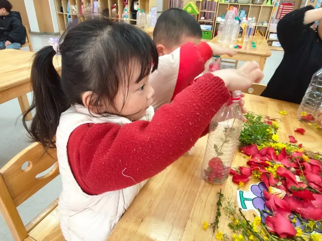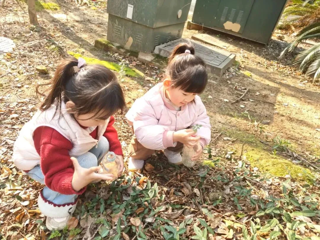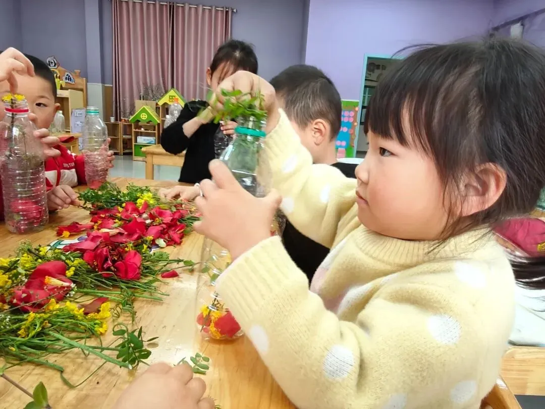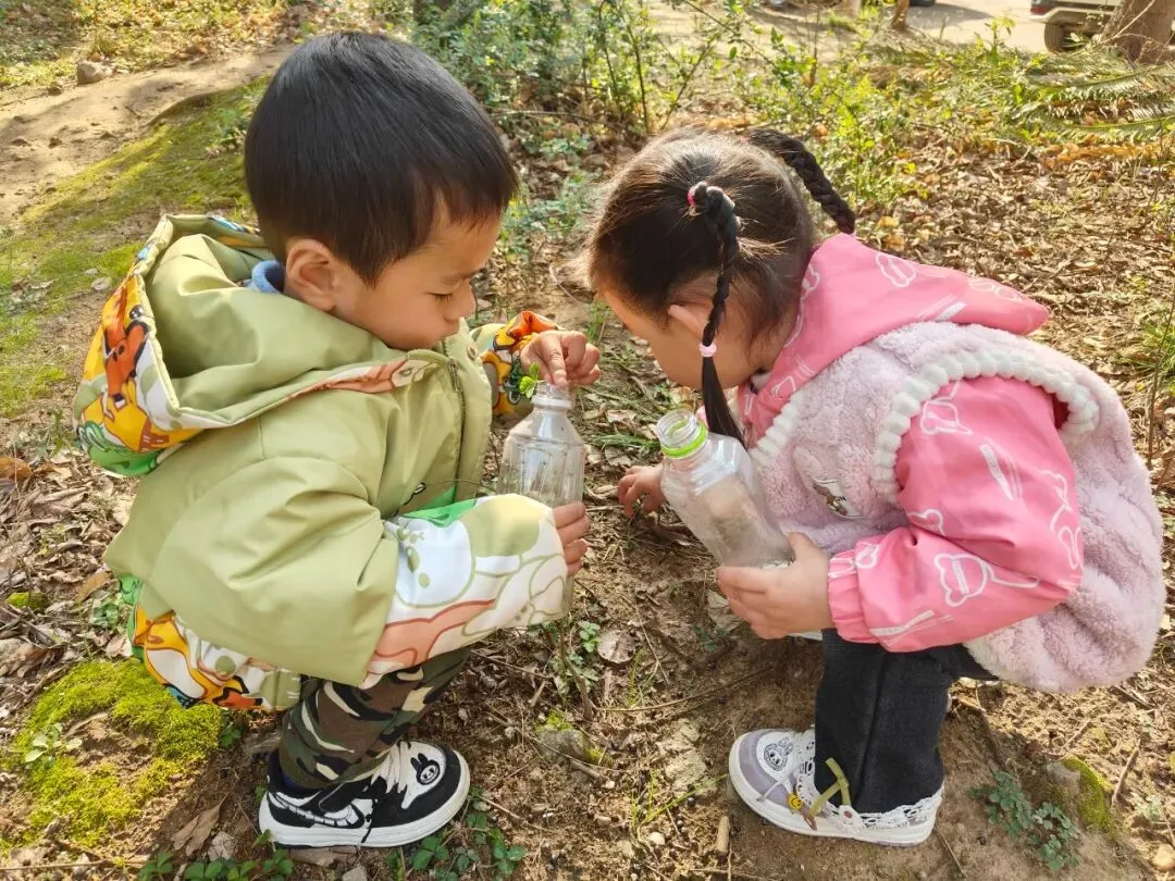 活动伊始,小班幼儿漫步户外,探索春日美好,细心采摘花草枝叶,小心翼翼放入透明瓶中,珍藏春日美好,在观察与触摸中感知自然的奇妙。