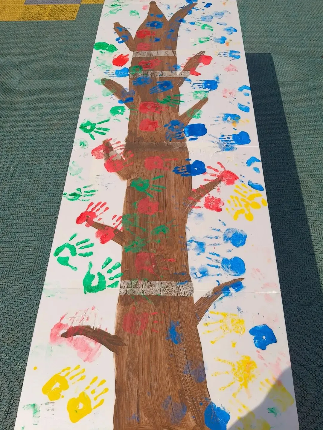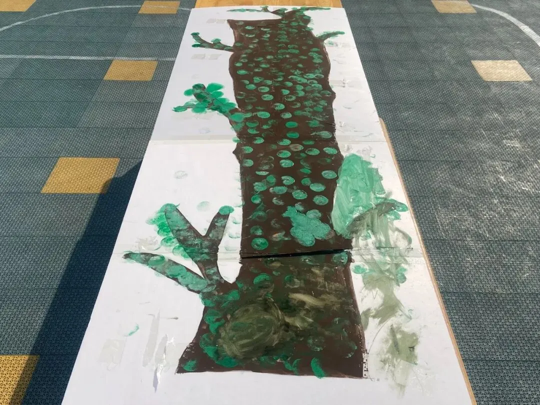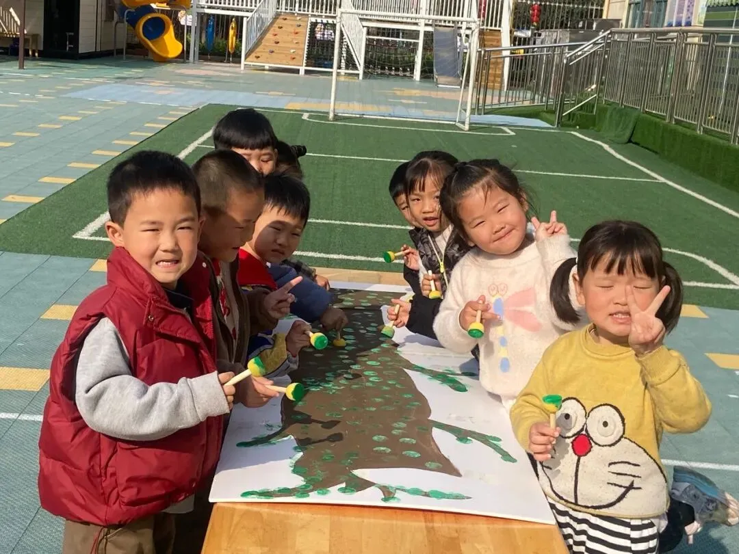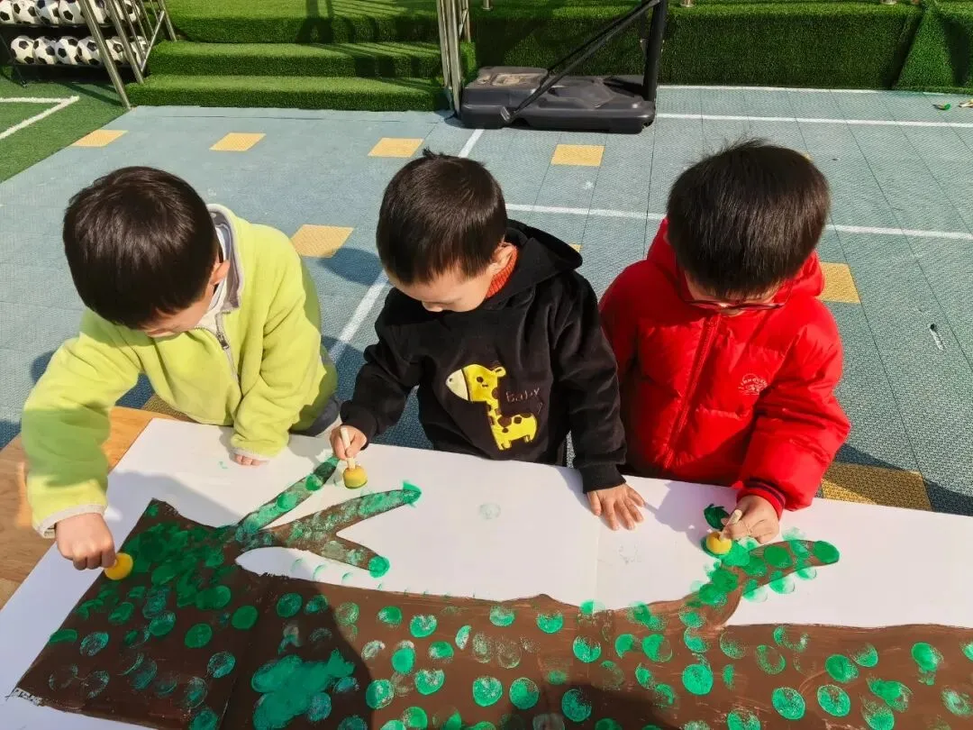 中班幼儿开展拓印活动,蘸取颜料轻轻拓印,给大树添上嫩绿的叶片。