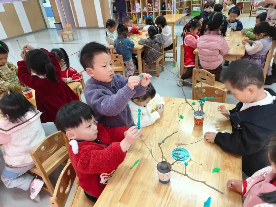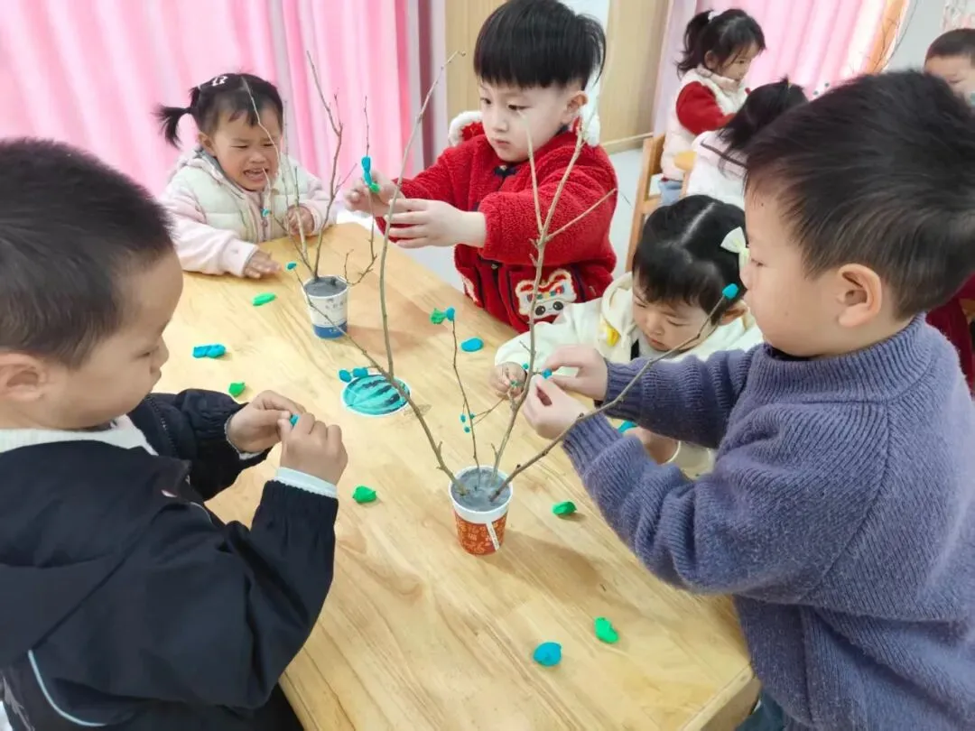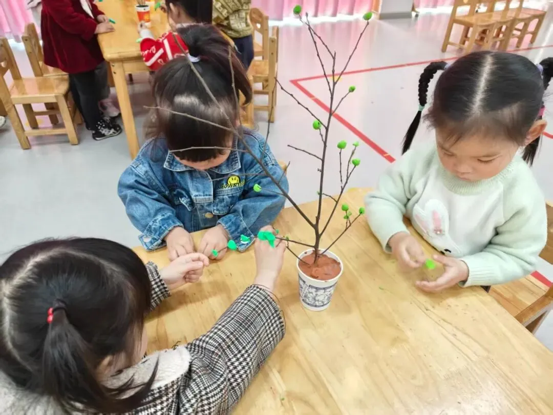 小班幼儿化身小小艺术家,用绿色黏土为树枝“穿新衣”,揉、捏、贴间赋予枯树枝新的生机,创意满满,趣味十足。