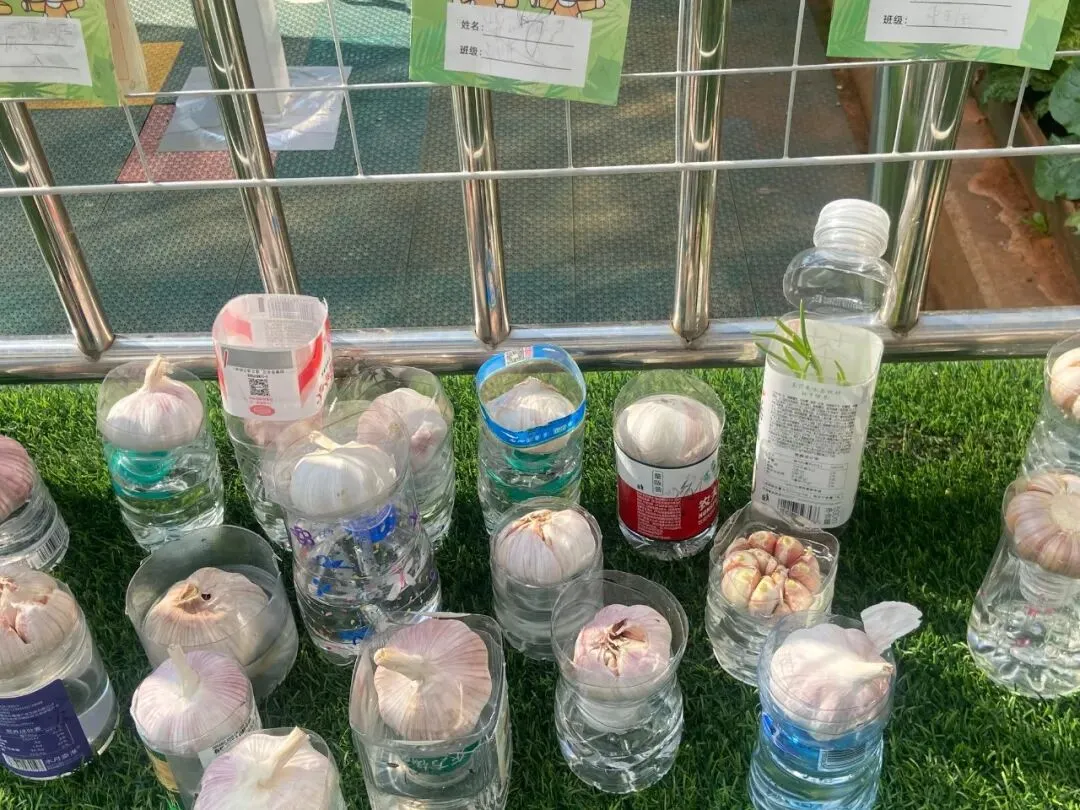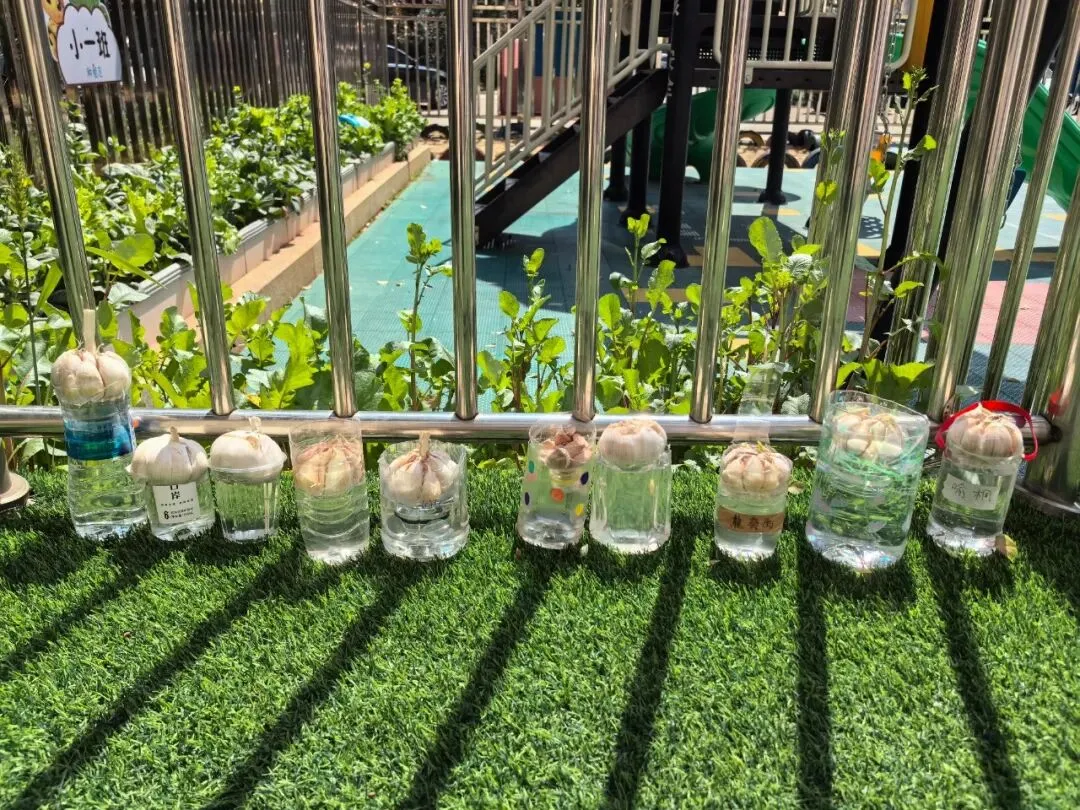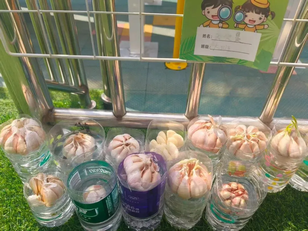 各班孩子们带来水培大蒜,整齐摆放于园内,共同照料、静待生长,在陪伴中感受生命力量,养成爱护植物的好习惯。